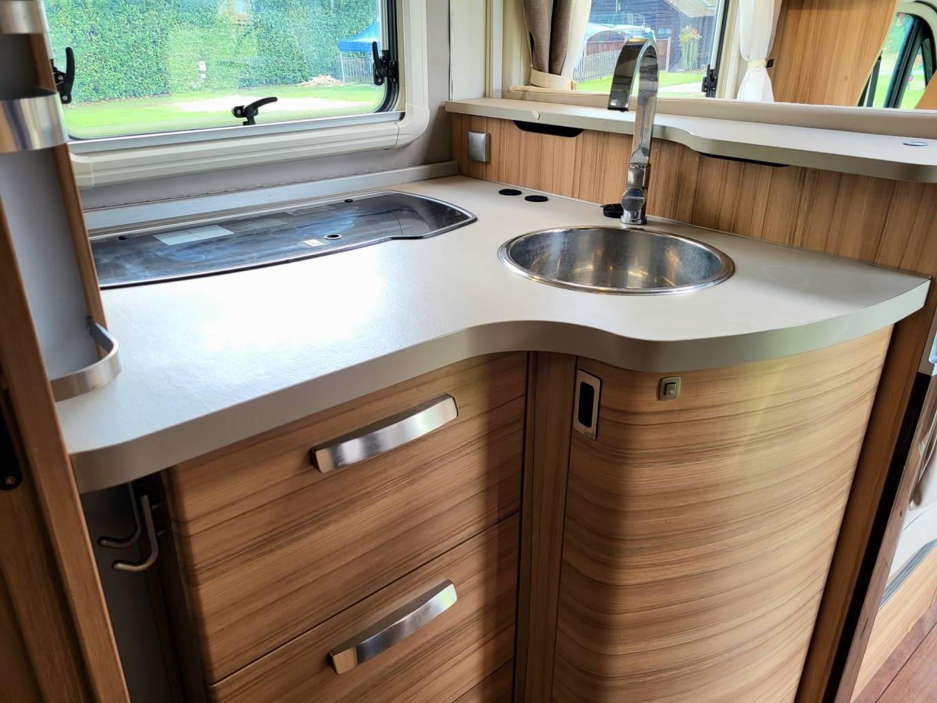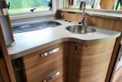 Kitchen - Central to the van the kitchen has all the facilities needed including a sink, three burner gas hob, full size fridge freezer and plenty of storage.
