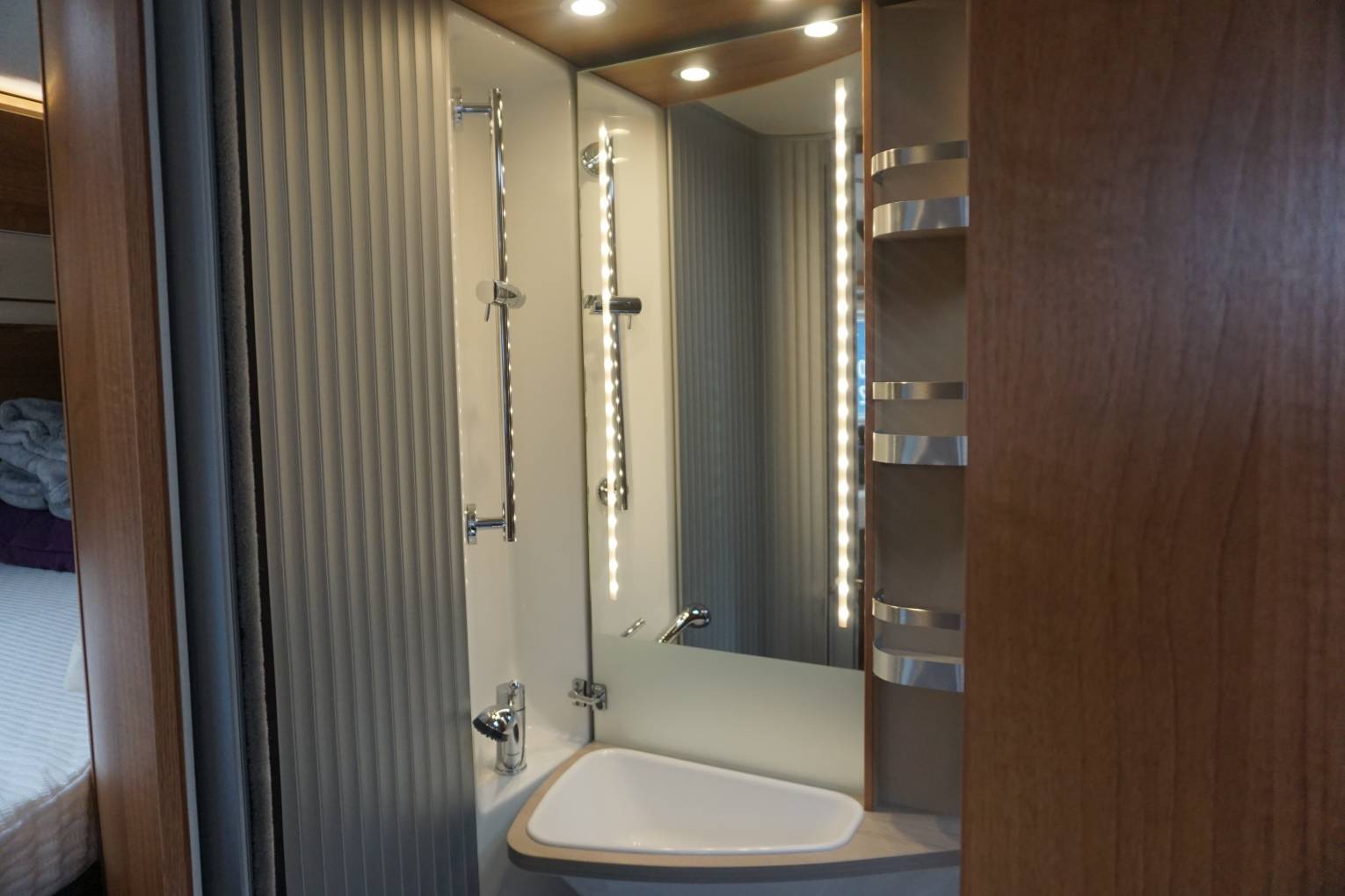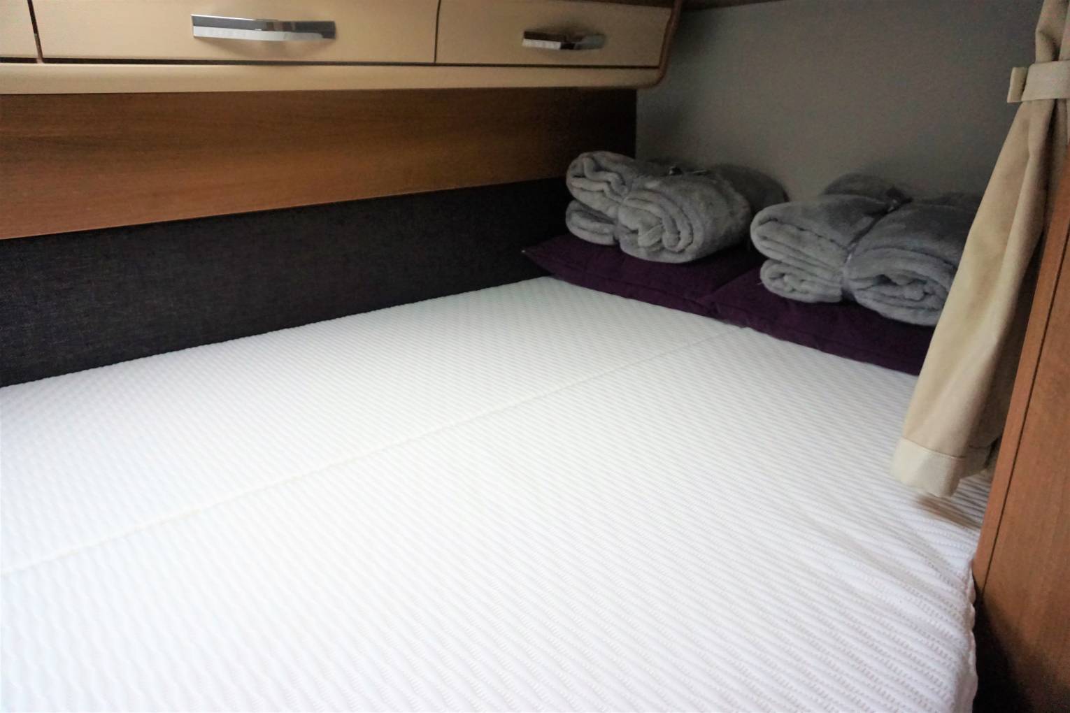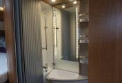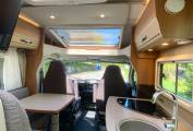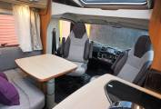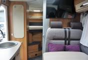 As you enter the Habitation door to the right is the kitchen, with 3 burner gas Hob, Fridge Freezer and plenty of storage cupboards, opposite is the lounge area with 2 travelling belts above this is the large Avtex TV, TV aerial and storage cupboards above, Up at the front are 2 Swivel front seats, Cab air con, Reversing camera, Sat Nav, Radio and Cruise control, all flooded with light by Cab sunroof. To the rear, a tambour door partitions the lounge from the bedroom and en suite facilities. You step up to the washroom, which also has its own tambour door. The washroom is very cleverly designed, all paneled for showering, there's a swivel-bowl toilet, but the piéce de résistance is the washbasin. It's on a large panel that swings to that is disappears completely when not needed.Opposite is the generous wardrobe. At the rear is the fixed double bed which is above the rear garage. Storage cupboards above.