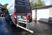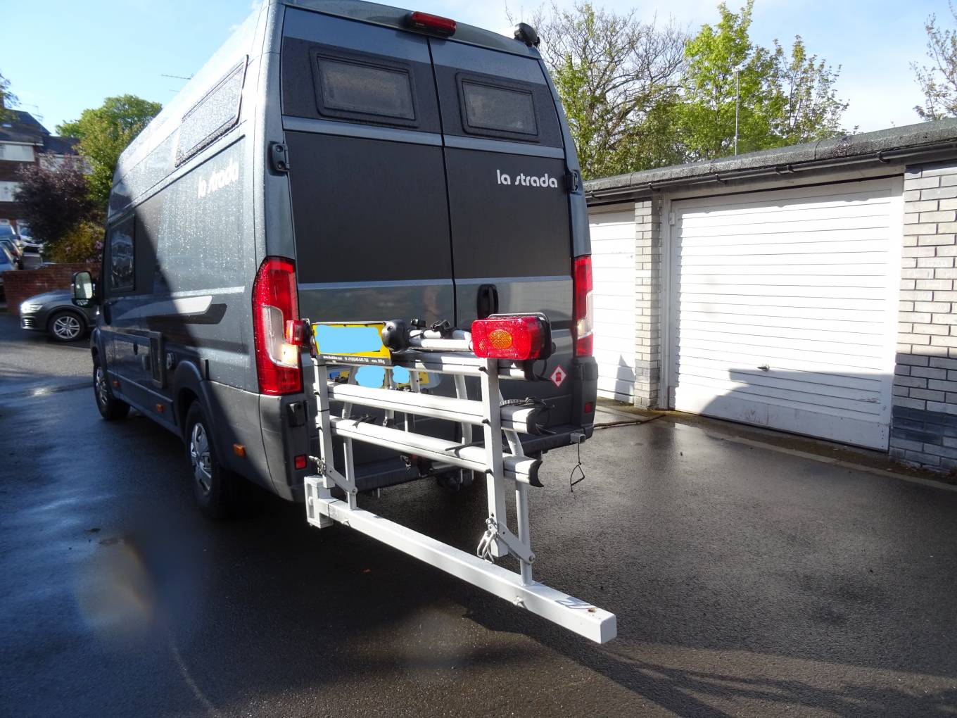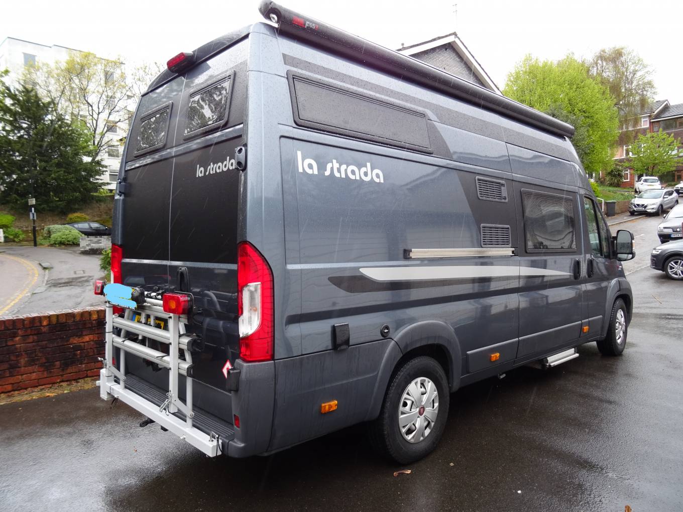 Externally it has a gas bbq point, external hot/cold water, electrical hookup, large rear garage access, rear doors fully open, swing out bike rack, tow bar, Fiamma awning.