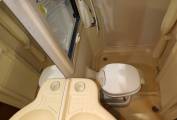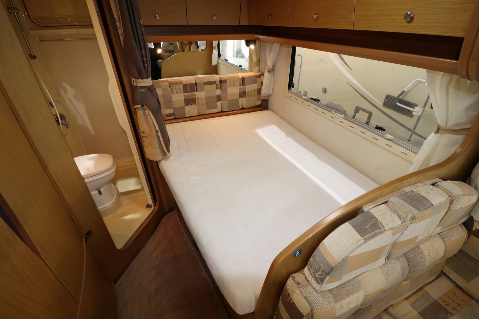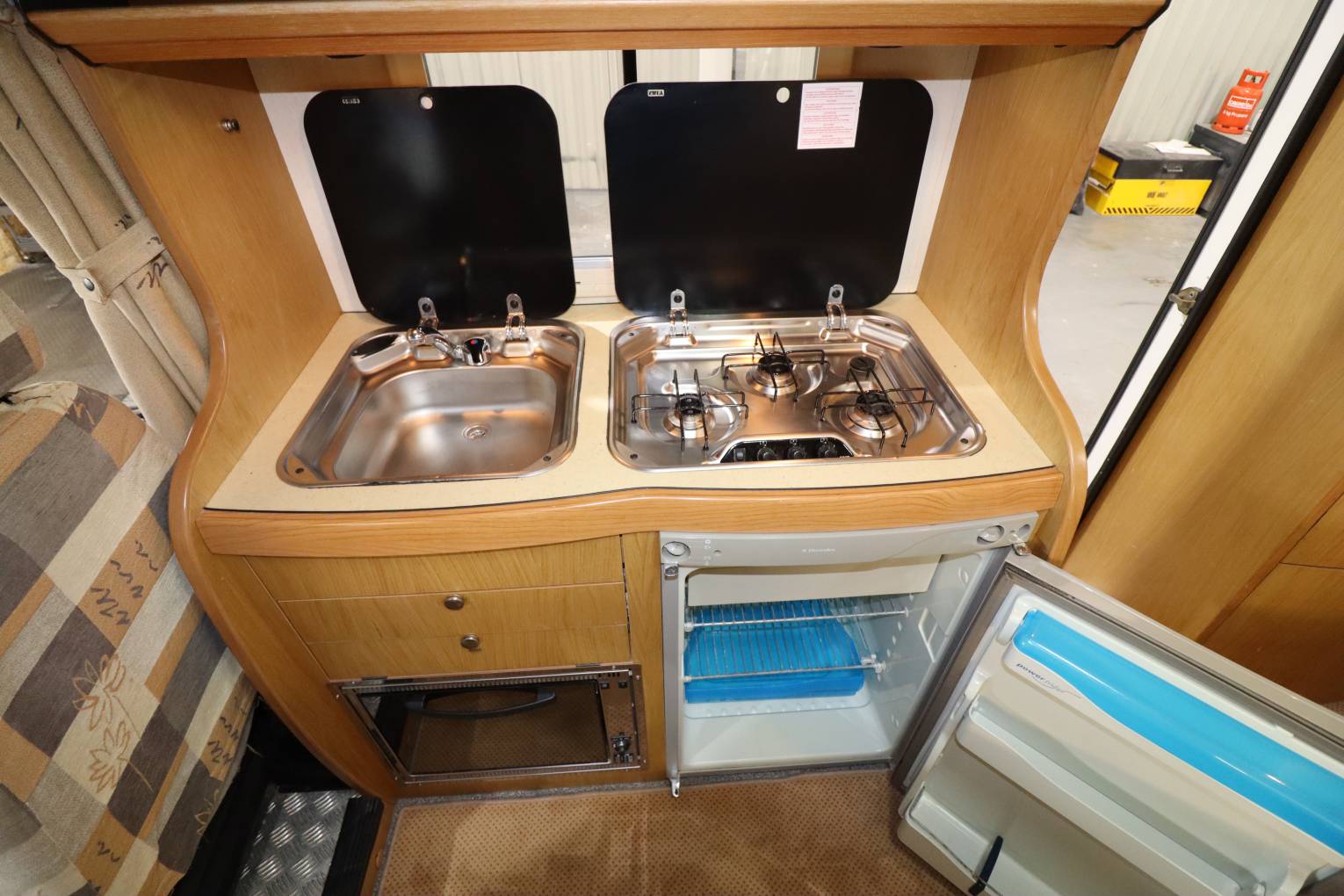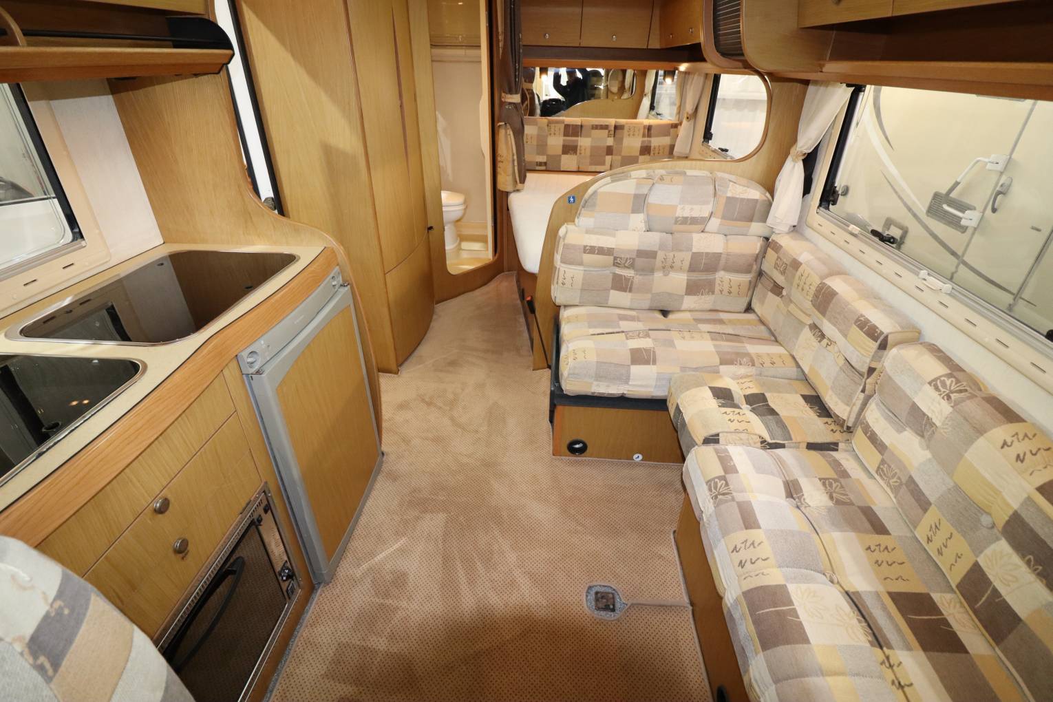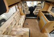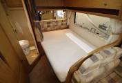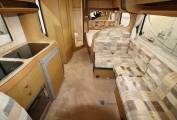 A large Garage, Fixed Bed Motorhome with travelling seats. There is a large fixed bed at the rear with the washroom adjacent. The Lounge area has a large L shaped sofa with two extra seatbelts. The kitchen is central with hob, grill, fridge and sink.