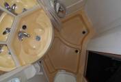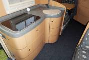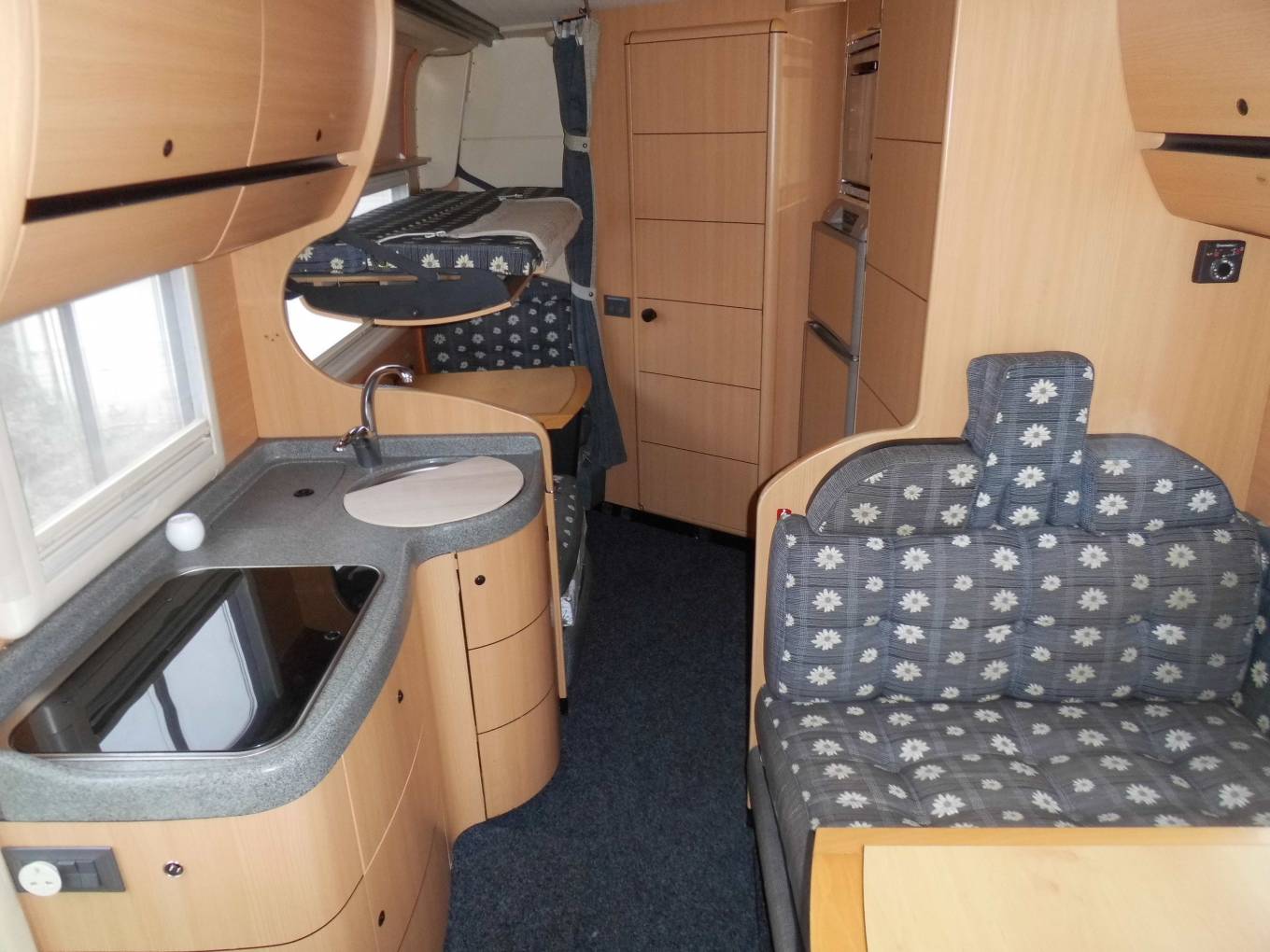 At the rear of the motorhome is a large bathroom which consists of a good size shower with a curtain, a sink with mixer tap, a toilet and a large mirror. As you exit the bathroom you find the kitchen which has all the facilities that you need to cook effortlessly while you are away on your travels. There is a three gas burner hob, a Smev oven and grill, a 3 way fridge freezer, a sink with mixer tap and plenty of cupboard and locker space to store your utensils and your ingredients.