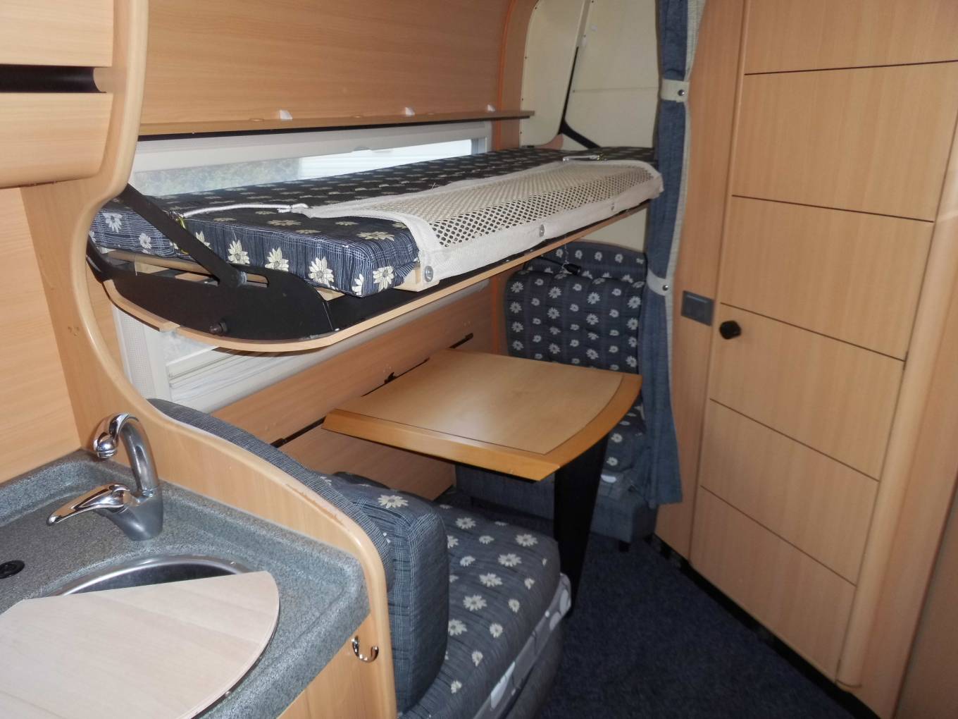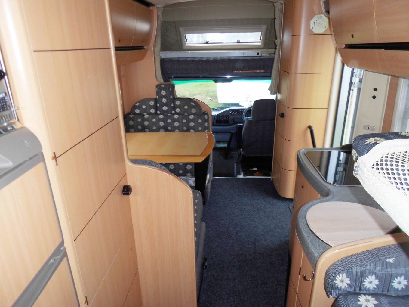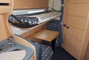 This is a 6 berth fully winterised motorhome with a double floor and 4 travelling belts. It would be an ideal starter home for a family or for Grandparents wanting to take their Grandchildren away. It would also be ideal for a couple who want plenty of living space. The 6 berths comprise of a large double bed above the cab which measures 78 x 52", the forward dinette makes up into another double bed and then at the rear of the vehicle you have an ingenious configuration with two single beds. The lower single bed is made up from the seating and dinette and above this there is a fold out single bed which emerges from the overhead lockers and this design really is quite stunning. When not in use it folds back into the lockers.