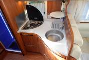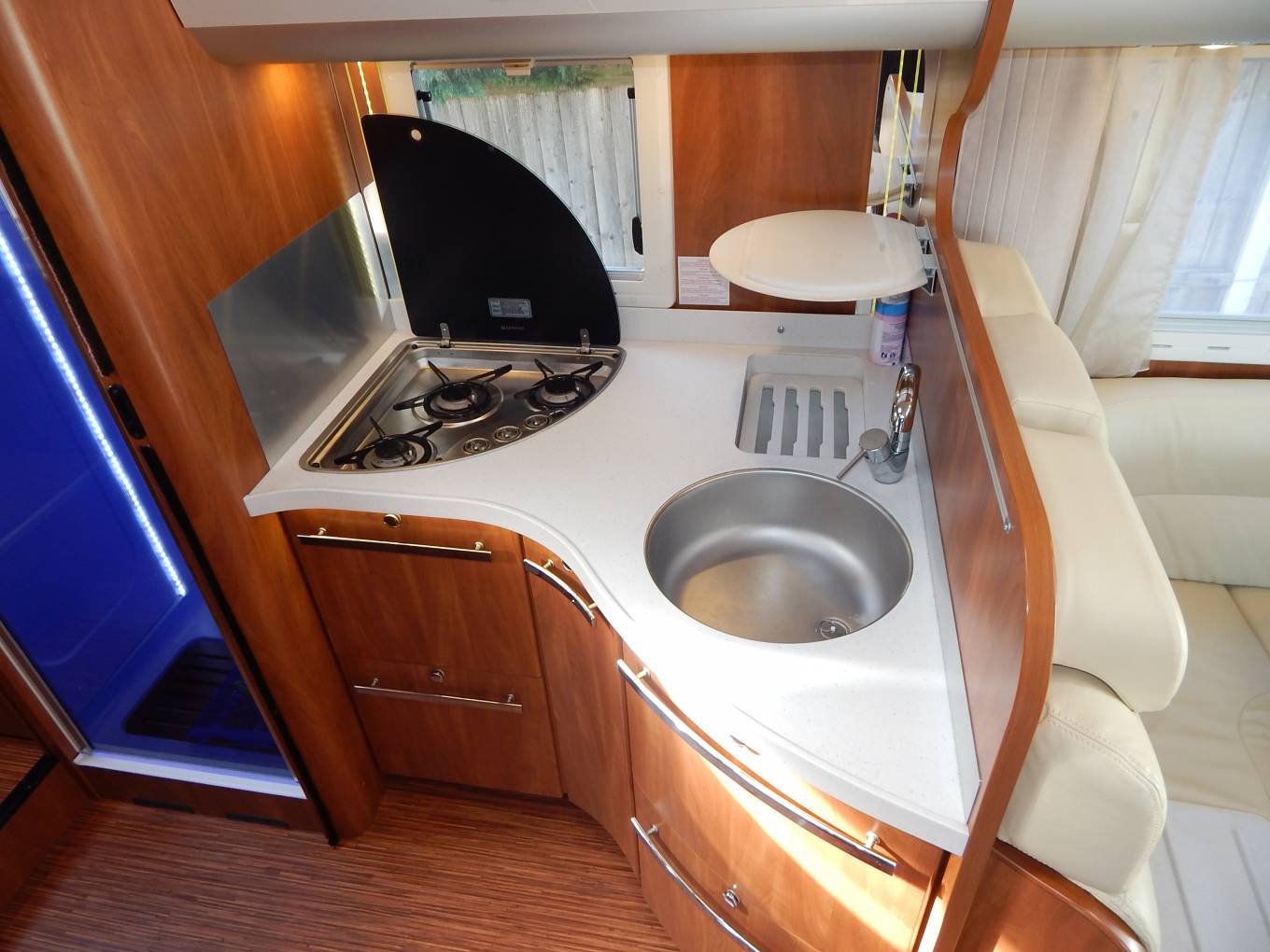 The Kitchen consists of an L Shaped Corian styled worktop with a round brushed metal sink & chrome mixer tap, a sunken draining area & 3 gas burner hob with 12v extractor above. Under the counter are ample drawers & cupboards for all your kitchen utensils. Opposite a Tec Tower Oven above, a Dometic absorber fridge freezer that is fully automatic and will run on 240v, 12v, or gas depending on whether you are plugged in on site or wild camping.