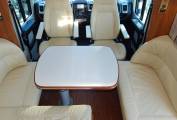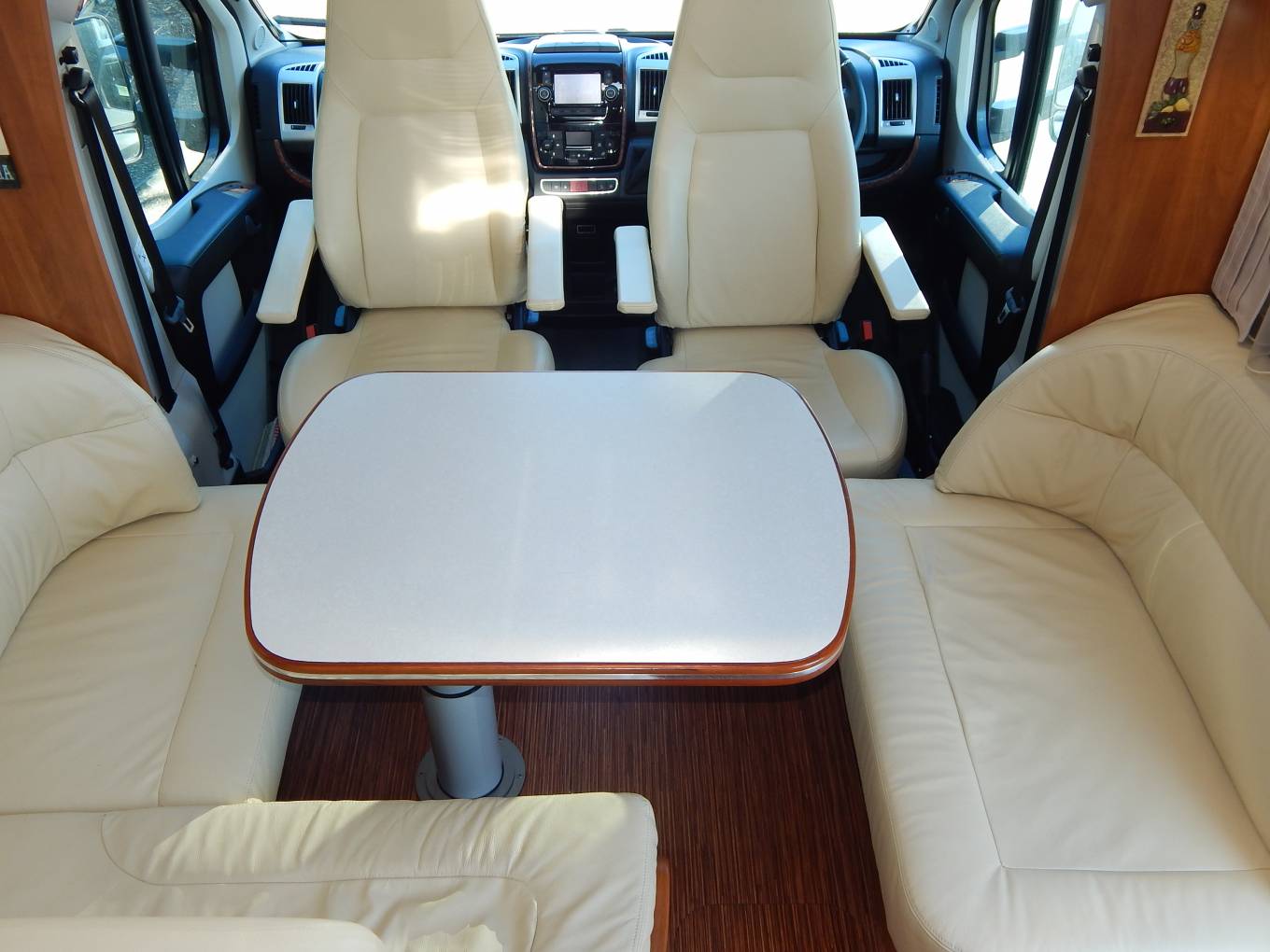 We enter the motorhome on the drivers side via electric entrance step immediately to the right of the habitation door is the dinette with a large L shaped sofa opposite, the forward facing part has 2 x 3 point seat belts for the 2 travelling guests. A single sofa just to the right of the habitation door, all are upholstered in Cream ‘VIP Club’ Leather. The front two seats also rotate to join this area so you could happily seat 7 if entertaining on site. The dining table can move in a fore and aft direction, but will also drop down to make up the 3/4 berth if required with addition of a large infill cushion. The Samsung TV drops down from behind the overhead cupboard.