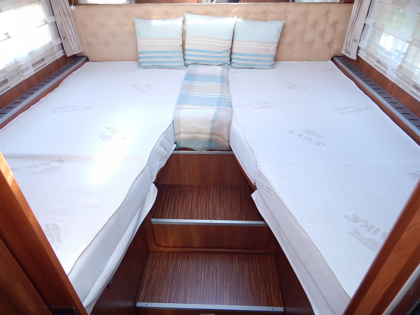 The Bathroom can be separated front and rear by solid doors and consists on the drivers side a Thetford swivel top fresh water flush cassette toilet white sink & chrome mixer tap built in to a vanity unit with mirrored cupboards above. opposite a separate shower room with wooden footboard subtle lighting, chrome mixer & large shower head. There is also a hanging rail for wet clothes.