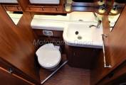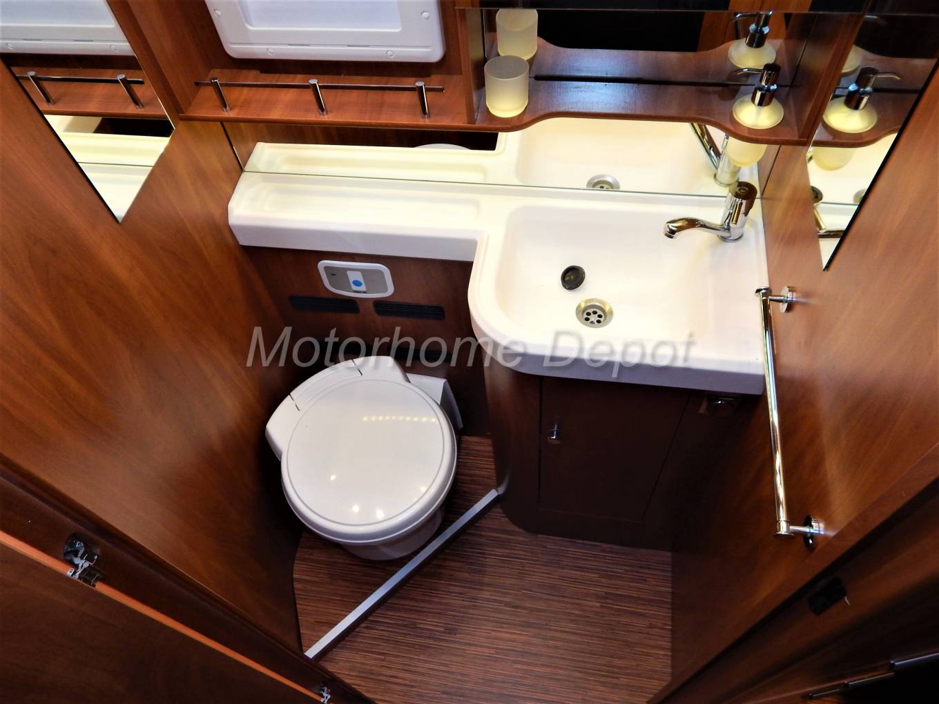 The Bathroom can be separated front a solid doors and rear by a curtain, it consists on the drivers side a Thetford swivel top fresh water flush cassette toilet white sink & chrome mixer tap built in to a vanity unit with mirrored cupboards above. opposite a separate shower room with wooden footboard subtle lighting Chrome mixer & large shower head. There is also a hanging rail for wet clothes.