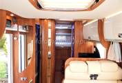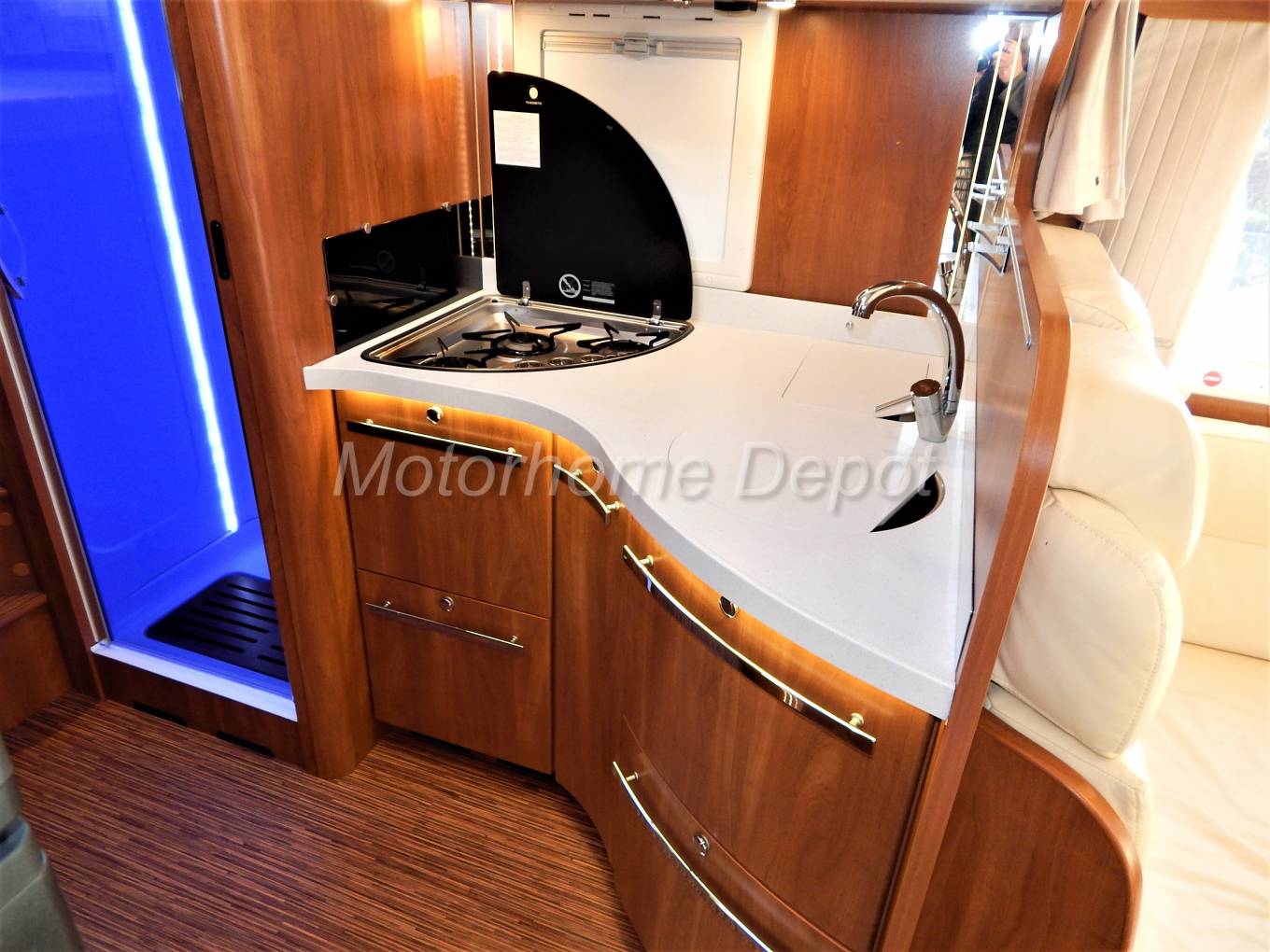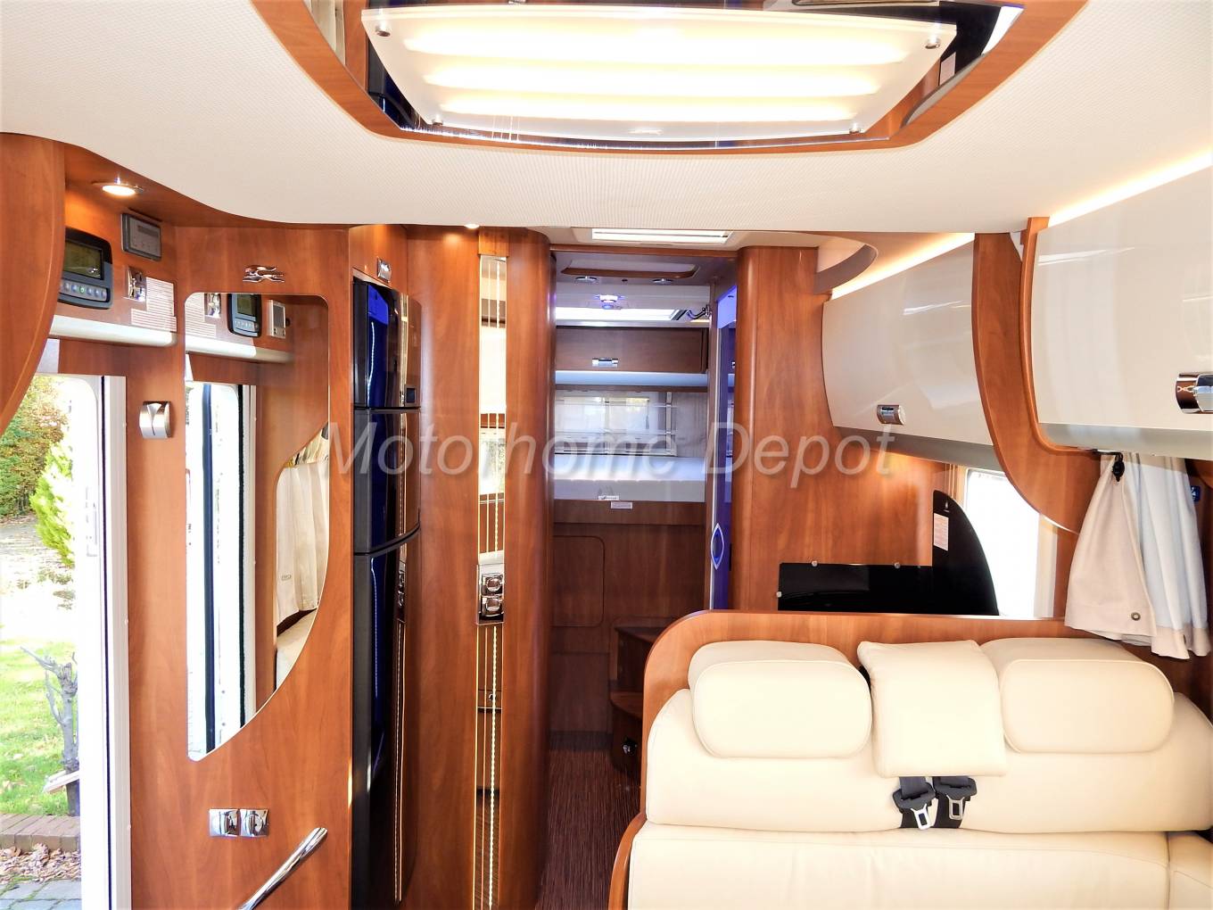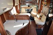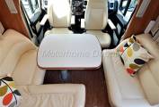 We enter the motorhome on the drivers side via electric entrance step immediately to the right is the dinette with a large L shaped sofa opposite, the forward facing part has 2 x 3 point seat belts for the 2 travelling guests. A single sofa just to the right of the habitation door all are upholstered in Cream ‘VIP Club’ Leather. The front two seats also rotate to join this area so you could easily seat 7 if entertaining on site. The dining table can move in a fore and aft direction, but will also drop down to make up the occasional extra berth if required with the use of an infill cushion. There is a TV point to the right of the habitation door.