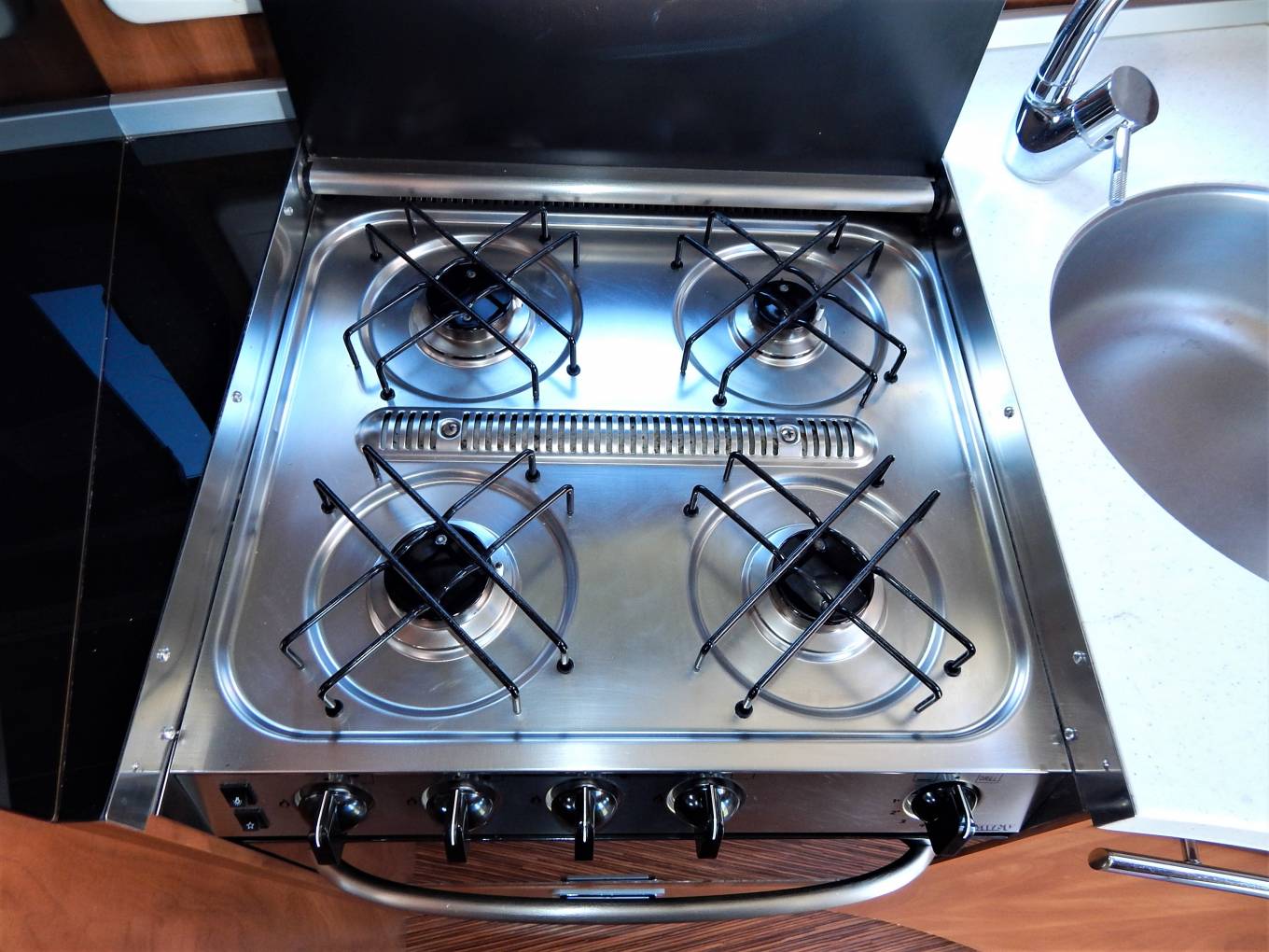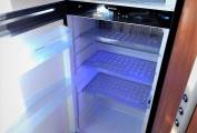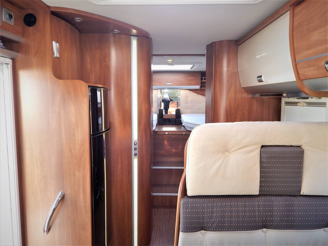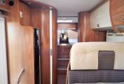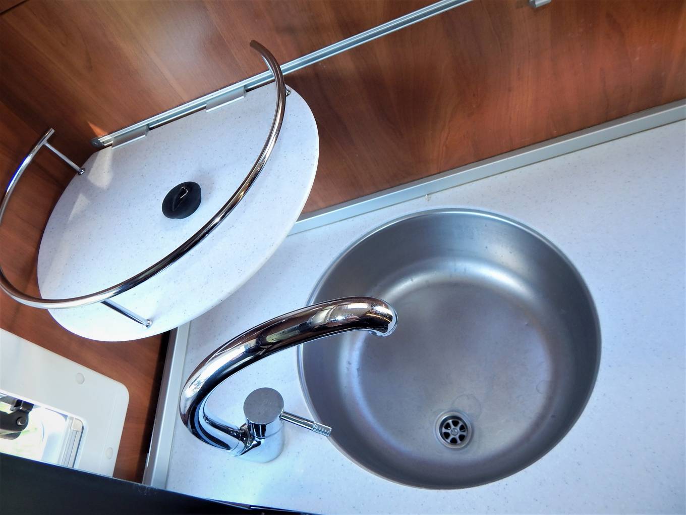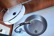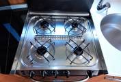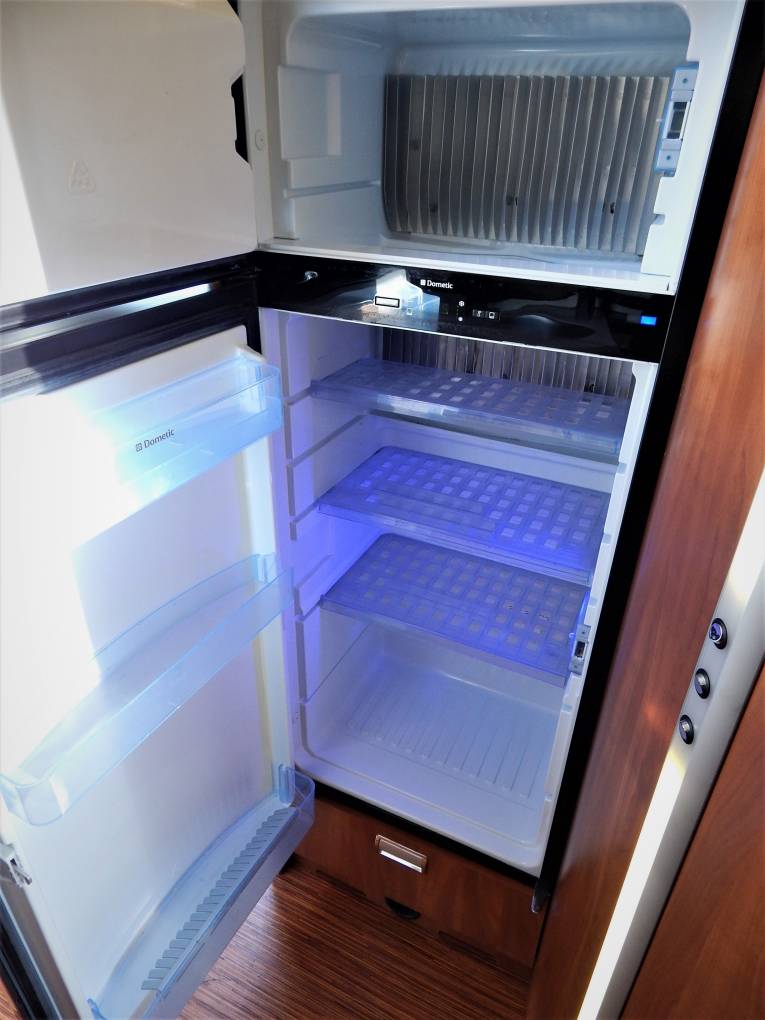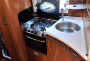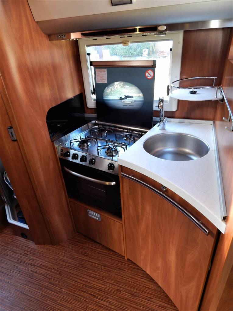 Immediately behind the dinette is the kitchen area which benefits from a large single brushed metal sink and chrome mixer tap. A large oven and grill to the left with a four gas burner hob above and a extractor unit under the cupboard. Under the counter there is ample cupboard and drawer space for all your kitchen utensils. Opposite there is a large 160ltr absorber Dometic fridge with separate freezer compartment, this can run on 240v, 12v or gas depending on whether you are wild camping or plugged in on site.