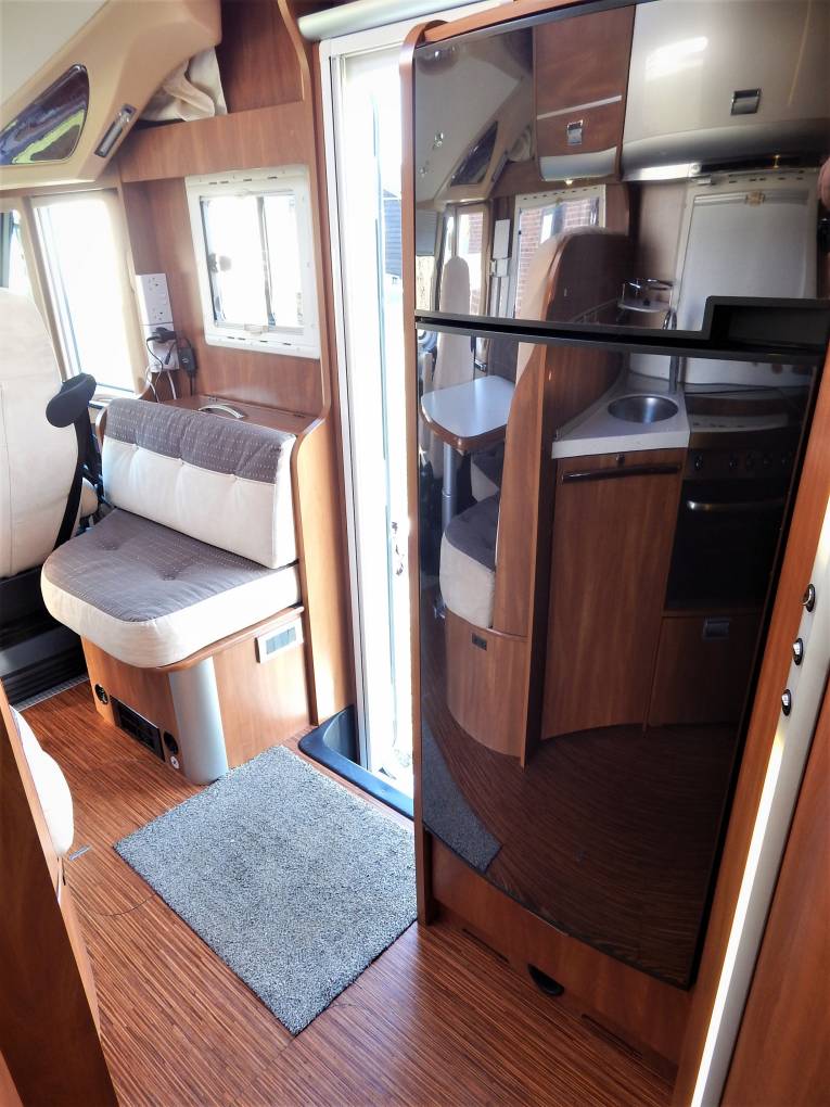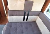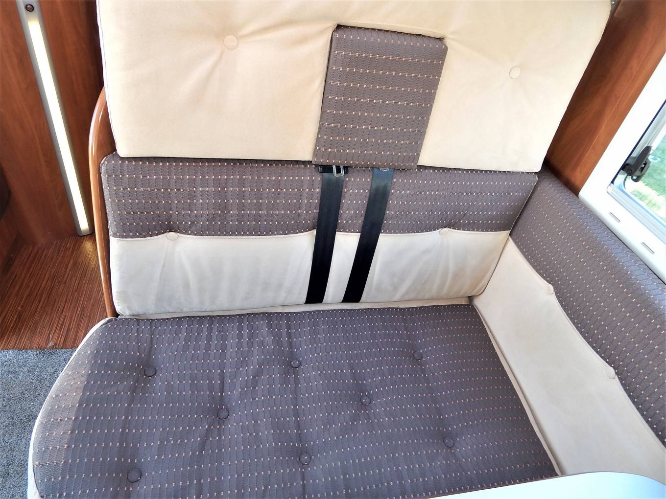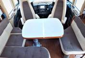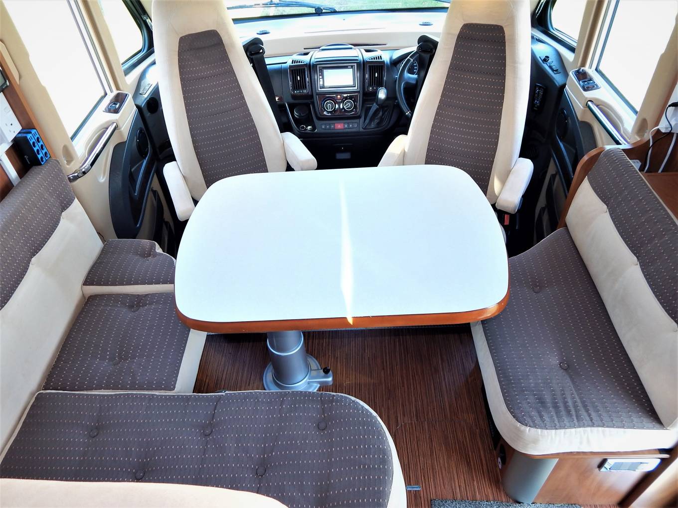 Built in the heart of Tuscany by the passionate Laika factory with dual floor construction to give excellent heat retention. We enter on the drivers side via an electric step the dinette is immediately to the right and consists of an L Shaped Sofa with 2 x 3 point seats belts on the forward facing part. a section of this sofa drops away for the inner passengers leg room. To the right of the habitation door is a single seat & both the drivers and passengers seat rotate round to join this area, meaning that you could comfortably seat 6 for dinner. The clever table can be moved in most directions and has two height settings via the telescopic leg.