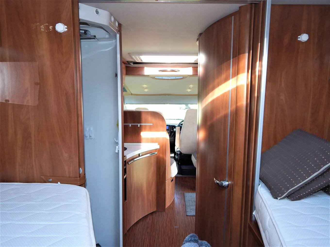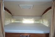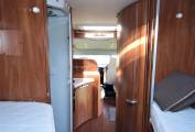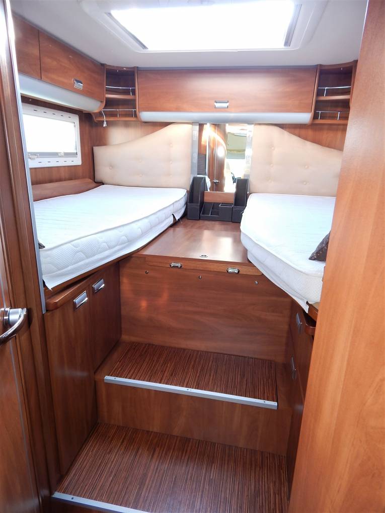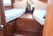 To the rear is the main bedroom with Twin single fixed beds which can be made in to a large double using an infill cushion and sliding board, the bed is then accessed via a small ladder rather than the built in steps. Both beds recline for reading in bed & there is ample cupboards above and below a hanging space and drawers.