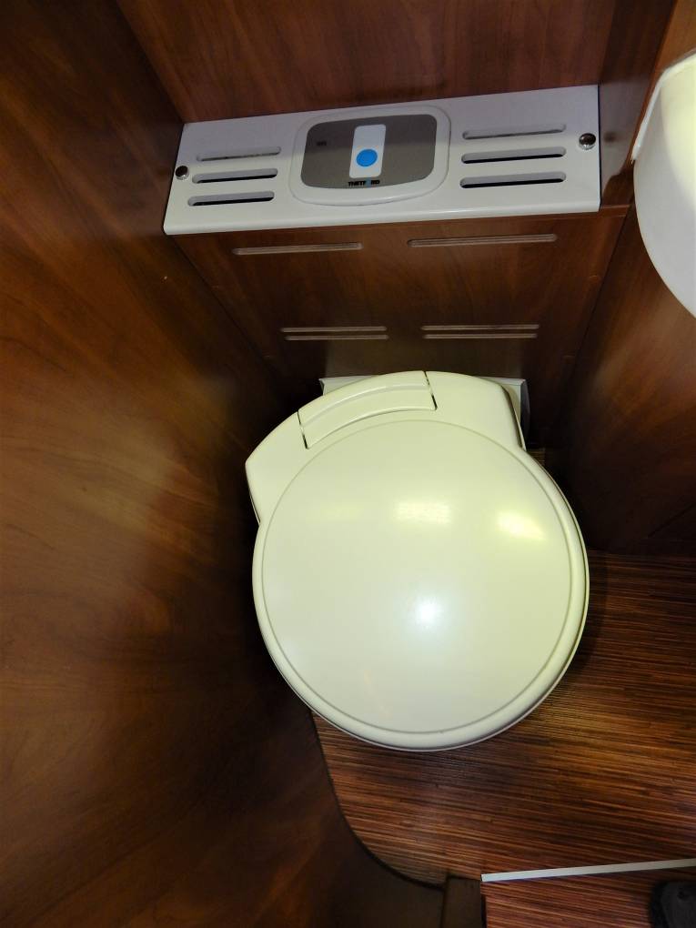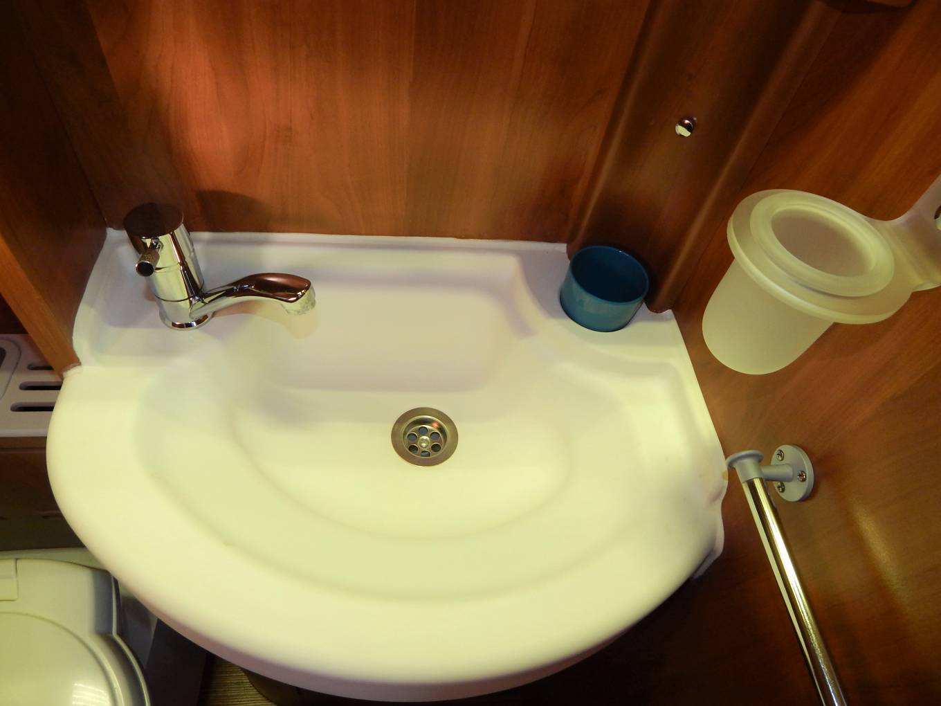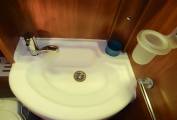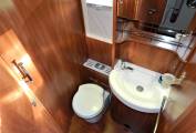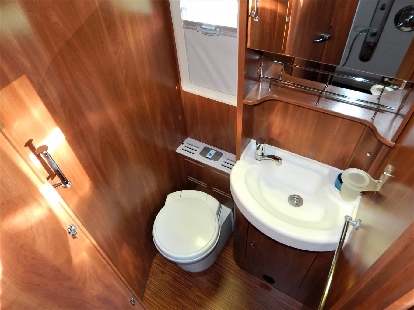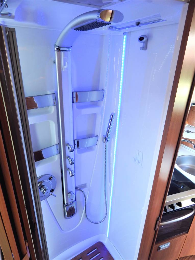 The bathroom is just behind this area & can be sectioned off from the front using the toilette door. The toilette is on the drivers side and consists of a Thetford Swivel top fresh water flush unit there is a white wash hand basin and chrome mixer tap above and a vanity unit. Above is a Fiamma extracting fan. The shower opposite can be sectioned off with perspex doors & has a luxury feel with subtle lighting numerous shower heads and a wooden footboard.