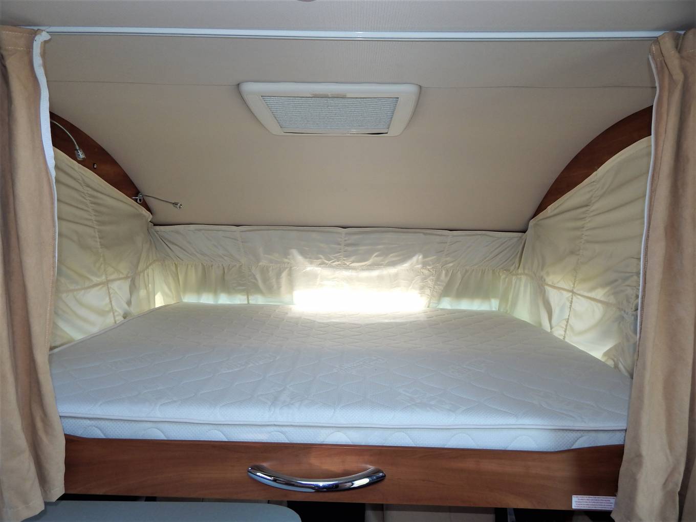 Above the cab is a large double drop down bed that can be easily pulled into place by firstly folding the front seats forward. it also had a privacy curtain and its own Heki for light & ventilation.