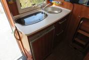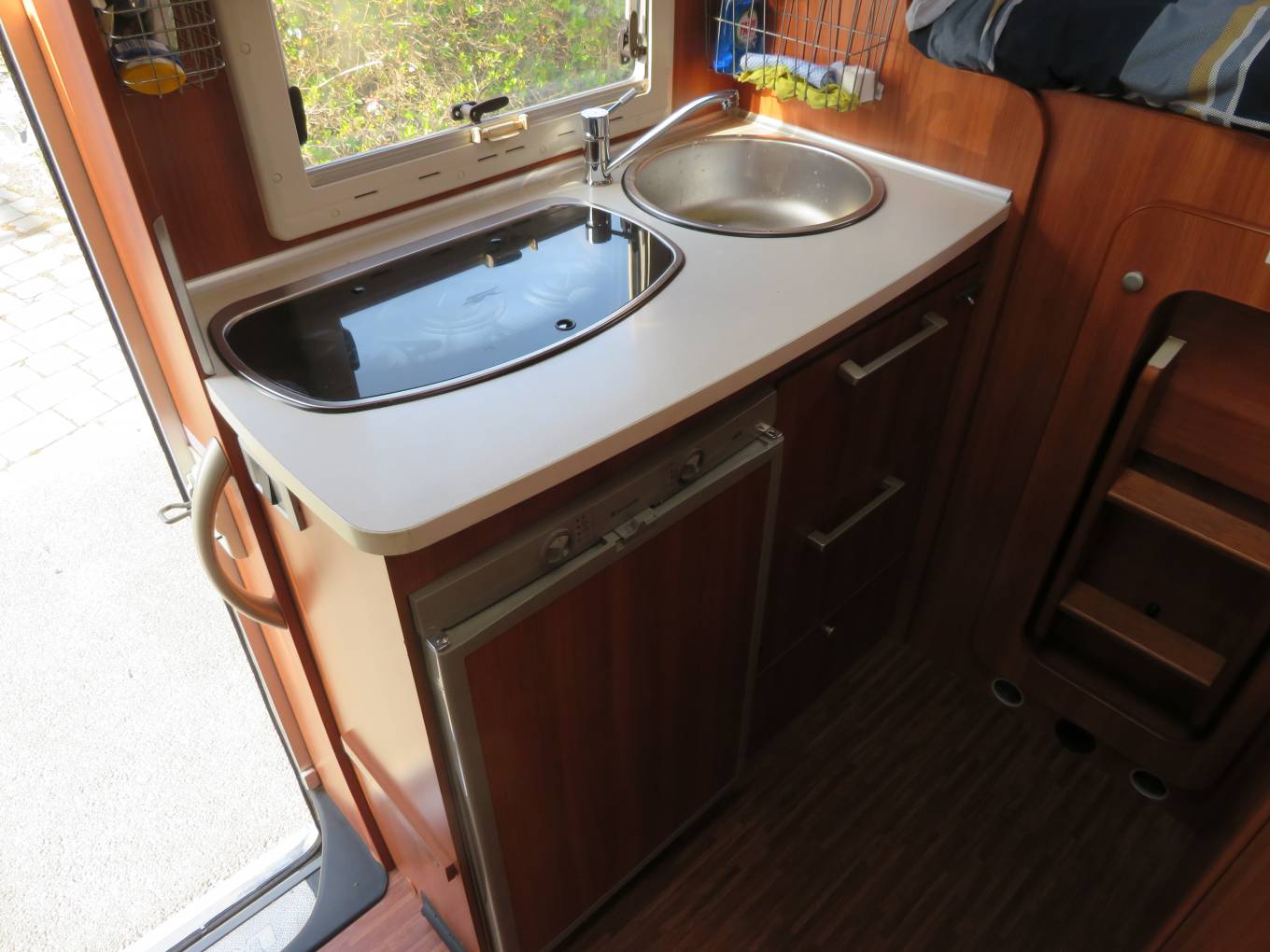 The Laika X595R really does maximise its space as its only 6 meters in length, At the rear you have a double transverse bed with a large garage below with doors to each side to really make the most of the space, inside the van also under the bed you have a good sized wardrobe and lots of storage options above. Moving forward to a really good sized washroom with shower toilet and vanity unit, Opposite is the Kitchen area with 3 x ring Hob, Sink, Fridge, Worktop and lots of storage cupboards and draws. At the front we have the dinette area with two forward facing seats with belts, a good sized table, a side facing seat and also the two front seats swivel around making it a great place to relax. Above this you have a electric drop down bed.