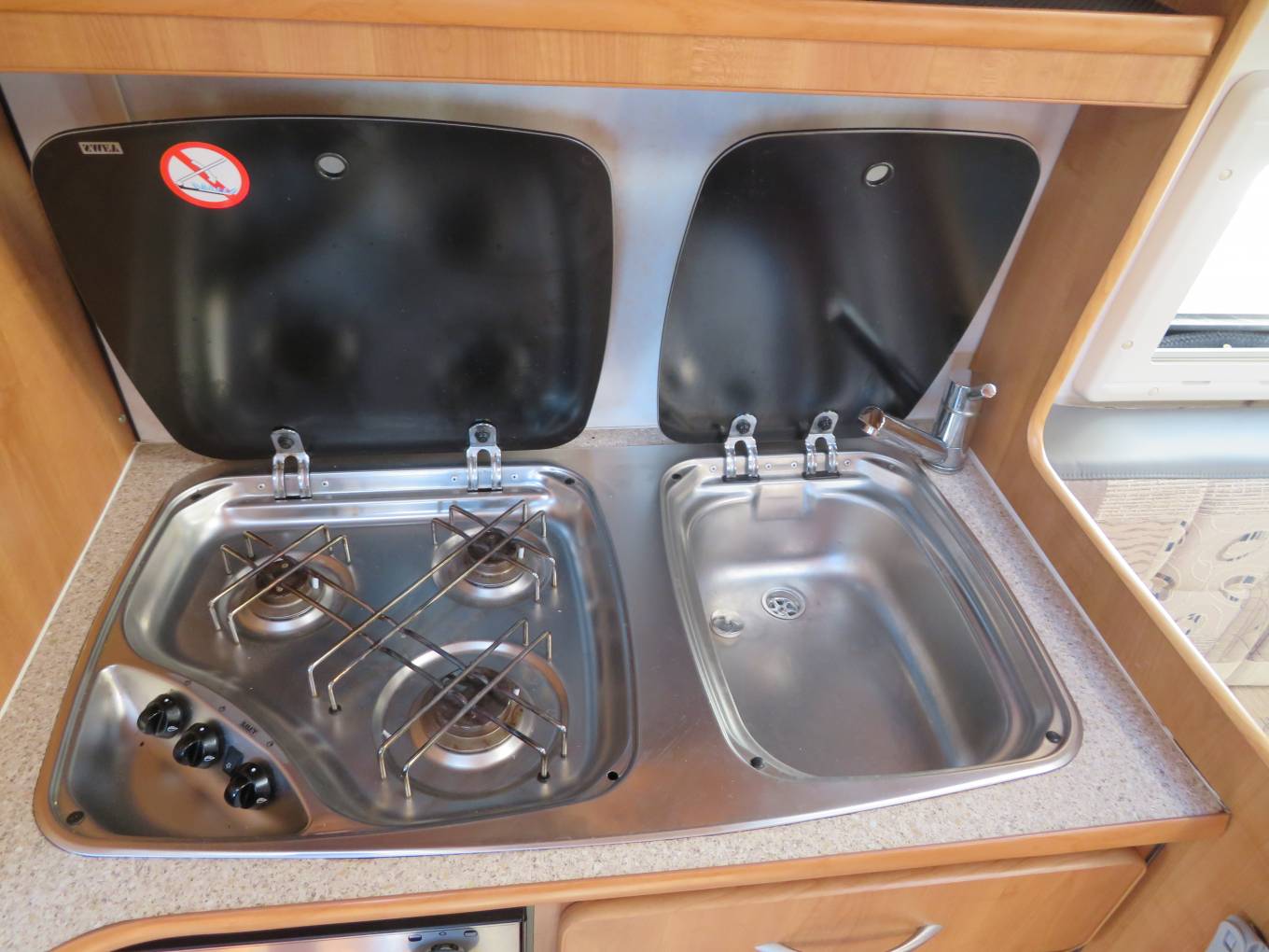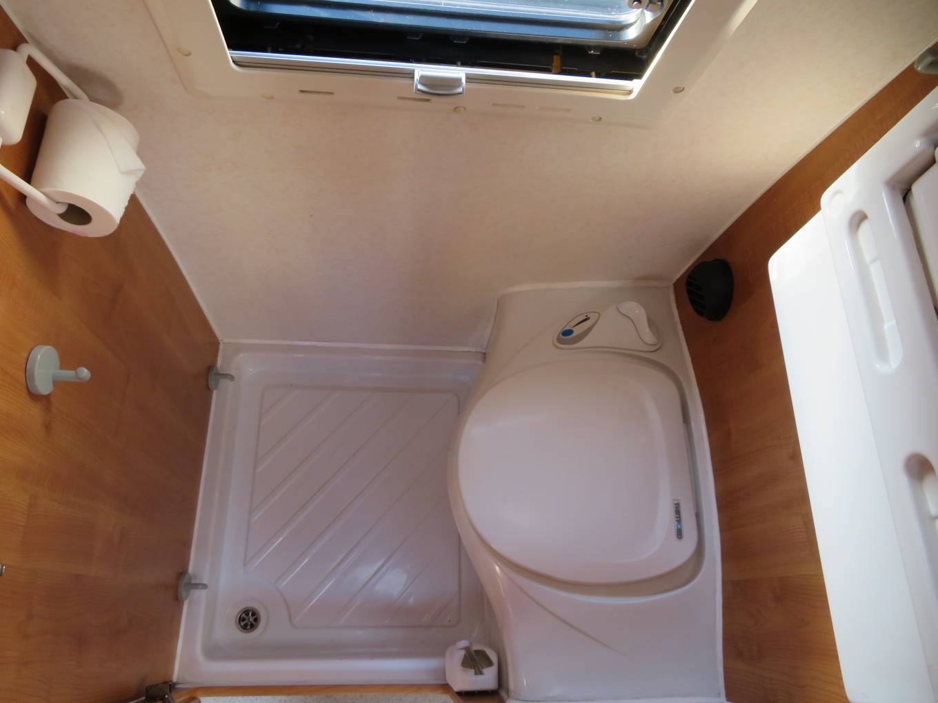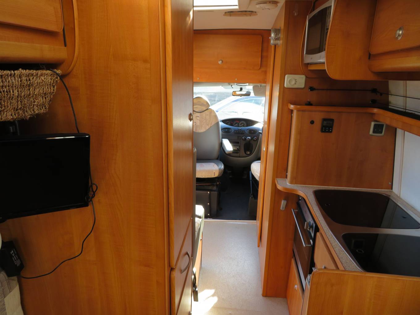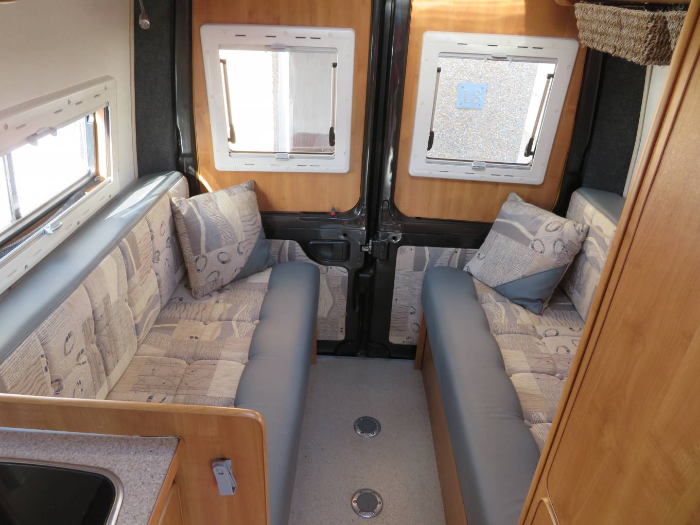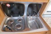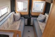 On entering through the large sliding side door there is a large single seat to the right with a seat belt which opens up into a single bed, beneath this are the leisure batteries and electrics, above this is the first of the skylights. Straight in front of you is the wash room with a toilet, wash hand basin and a shower, the tap from the sink extends to double up as the shower. As you come into the vehicle on the right is the large wardrobe with a single draw beneath and a cupboard below that which houses the gas bottle, opposite this is the kitchen area which has a 3 burner hob, a single sink with mixer taps, a combined oven with grill below which under this is a cupboard this houses the boiler for the heating, there is a fridge with small freezer compartment next to it, a microwave above and storage cupboards, to the rear are the 2no bench seats which convert into a double bed, 2 sliding windows to the sides and 2 fixed windows to the rear, above there are 6 storage cupboards a large skylight and a TV/DVD player with aerial. There are 2 tables and 3 mounting positions throughout the van. All the windows and skylights have fly screens and roller blinds. There is a Vango air awning, electric hook up lead, leveling blocks and a water canister should the right price be achieved.