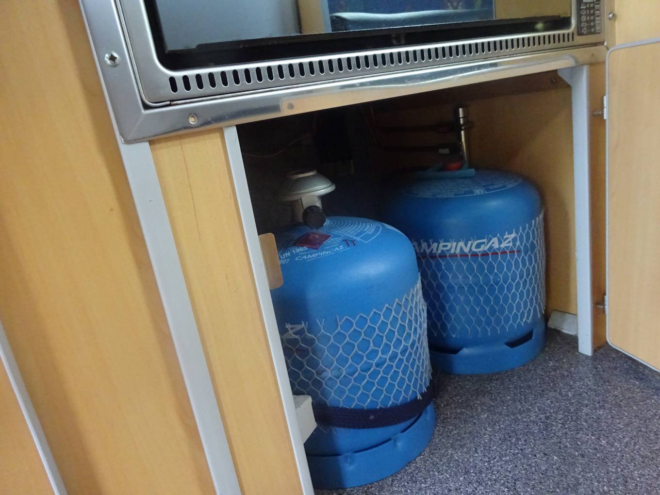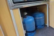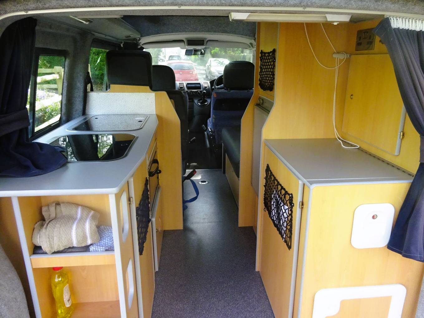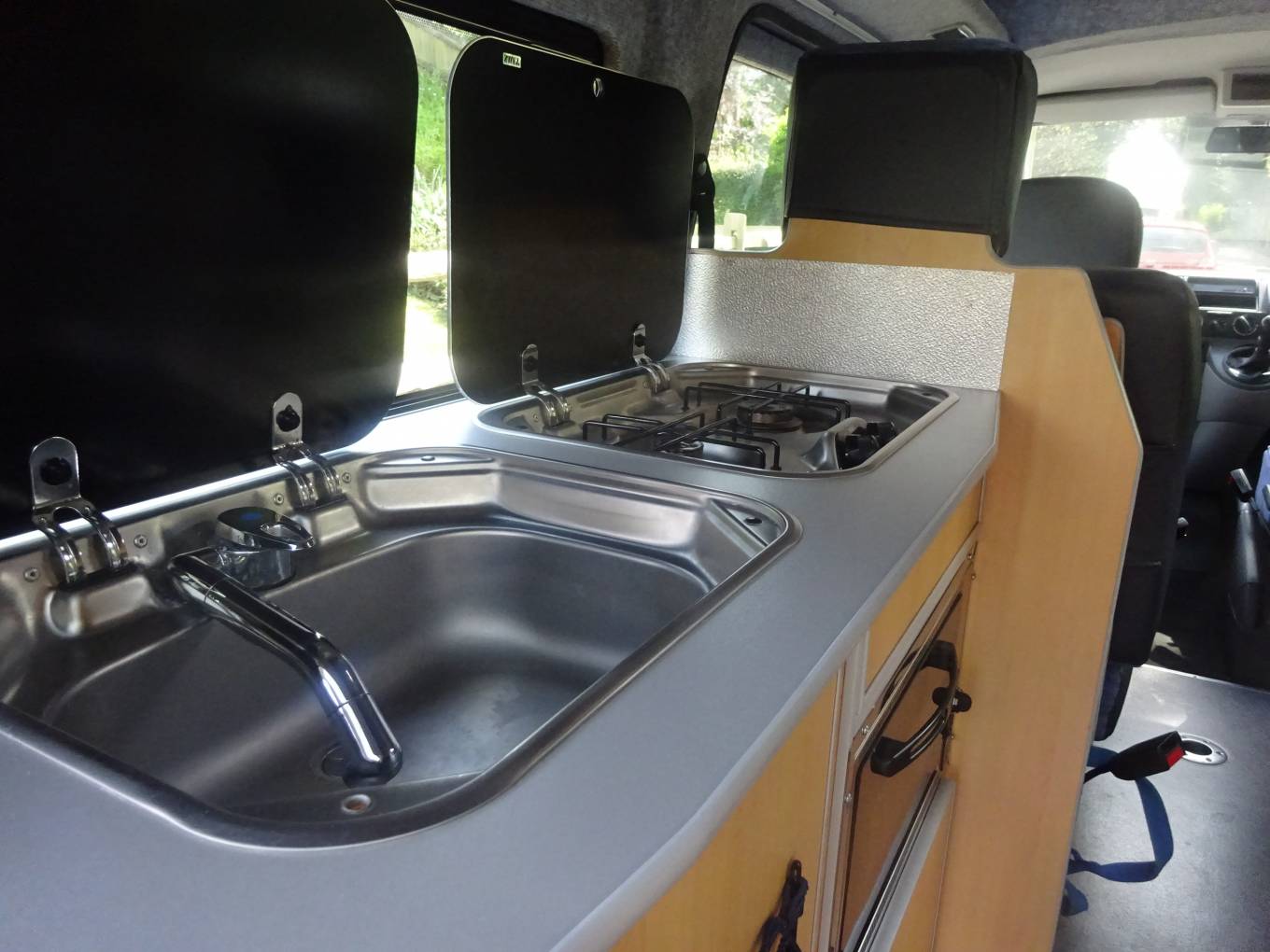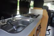 The high top with side windows and central skylight make for a good sense of space. All fittings, and fixtures are present and correct. Two butane gas bottles.