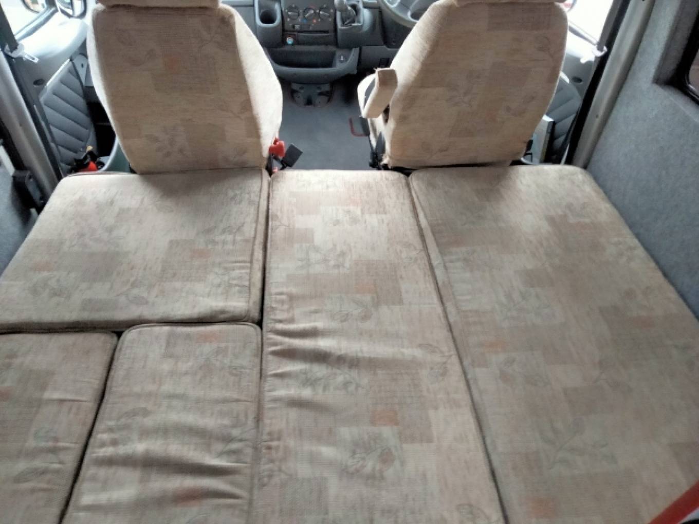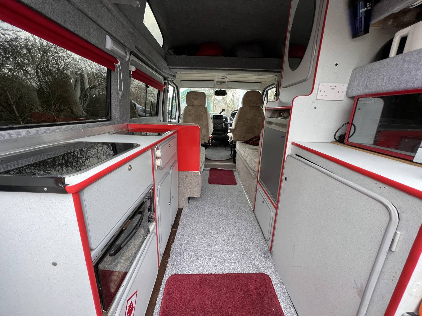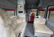 In through the sliding side door is a forward facing rear seat which faces the front passenger seat when swivelled round. On the far side behind the drivers seat is a two person settee.