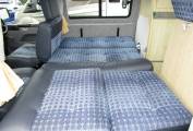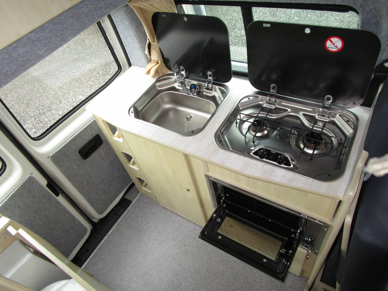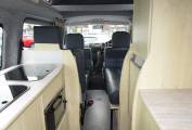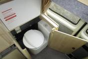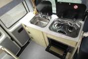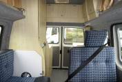 The lounge area is entered through the side door and features a large bench seat and single seat with seatbelt, this can comfortably seat four when utilising the front swivel passenger seat and converts to create a good sized sleeping area. Behind the lounge is a well equipped kitchen area with 2 burner hob, oven and grill combination, sink and fridge with ice compartment. At the rear of the vehicle is a casette toilet which is housed in a cupboard that allows it to be stored out of sight. The roof houses the second sleeping area which would suit 2 children.