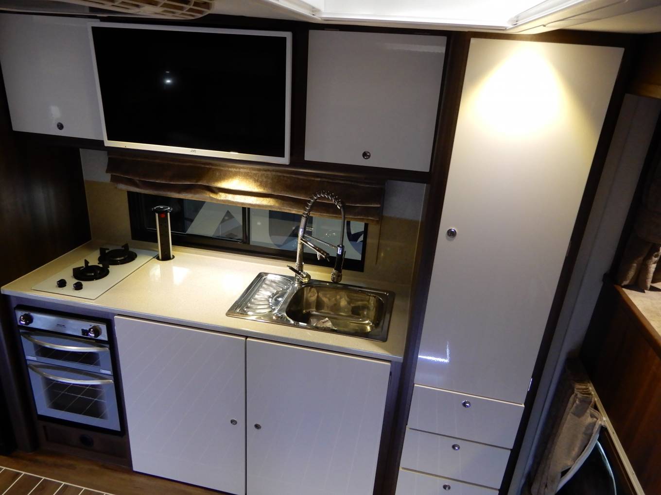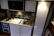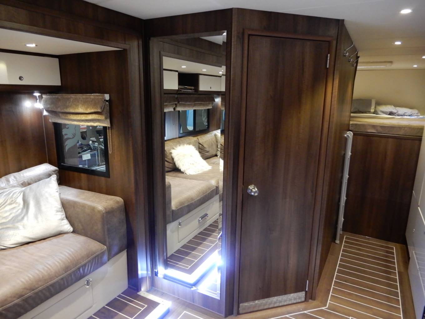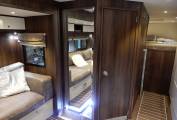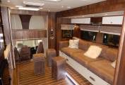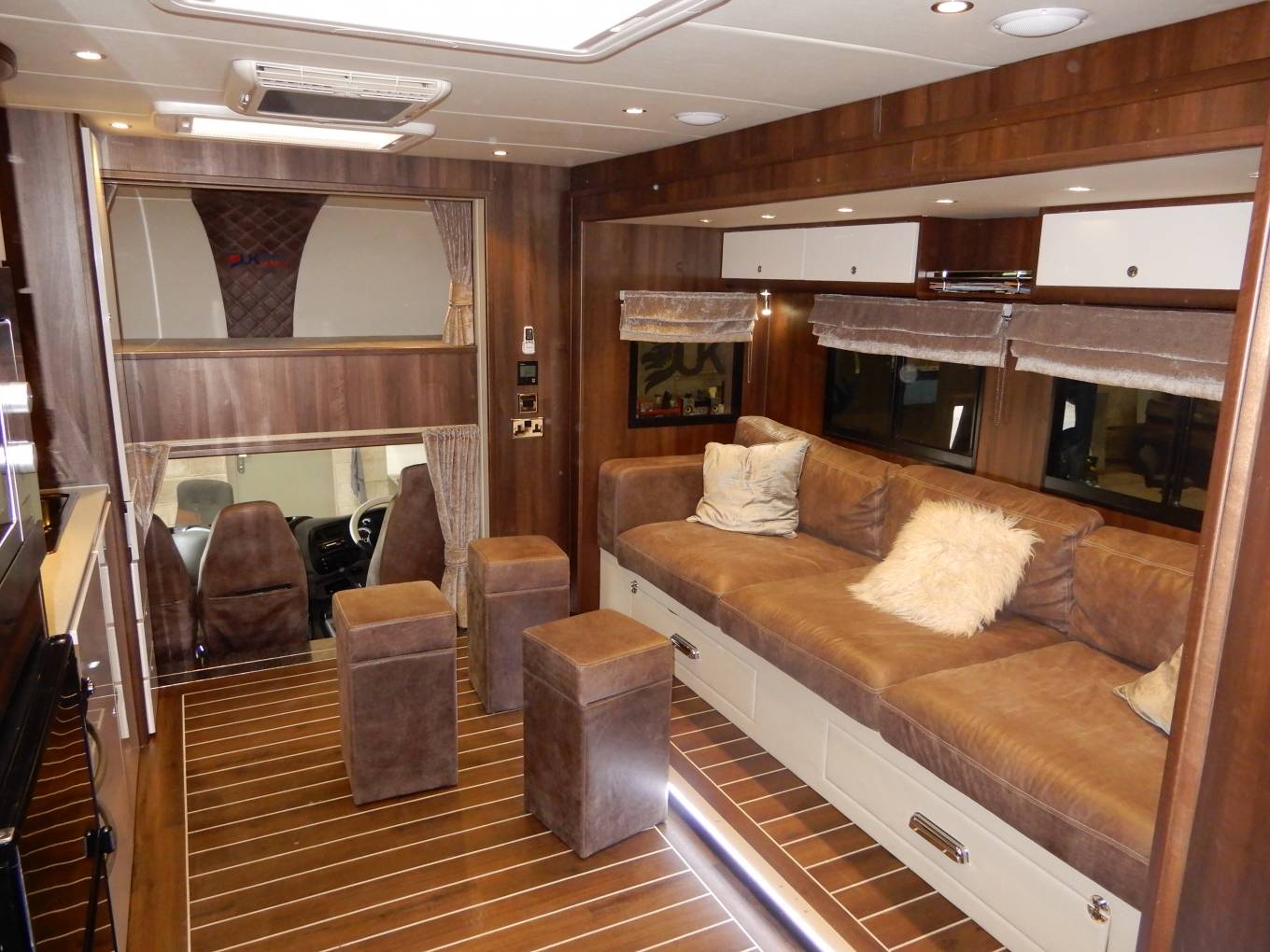 Inside you have 10ft pop out making room for a stylish Luxurious leather sofa with pull out draws and the sofa can be made as bed if required. also surrounded by led lighting and cupboard space plus X3 stools. you have a large spacious central living area which will include tables made to size once purchase agreed, with a Kardean flooring, plenty of room for family gatherings and plenty of space, Large sky lights, Large tv, blue tooth wireless speakers, enjoy the benefits of 2200 kw air-con unit, satellite dish with an auto finder also a large cab overhead double bed.