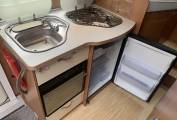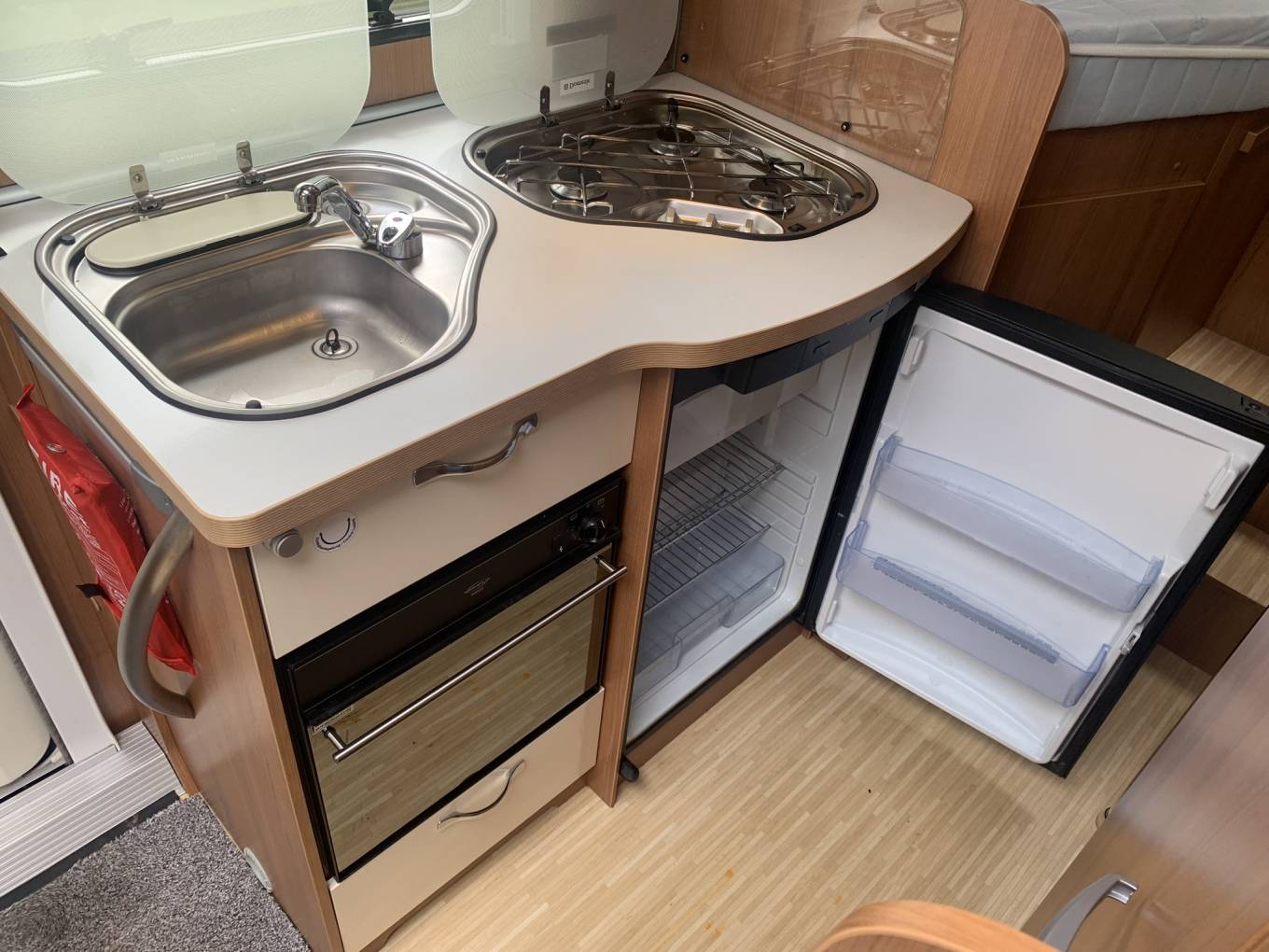 Moving through to the centre of the motorhome, we come to the kitchen area where there is a 3 ring gas hob and Spinflo oven supplied from the gas bottles located in the garage cupboard. Next to the cooker is the sink with mixer tap and underneath is the Dometic 3 way fridge with freezer compartment as well as several drawers for cutlery and cooking equipment.