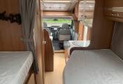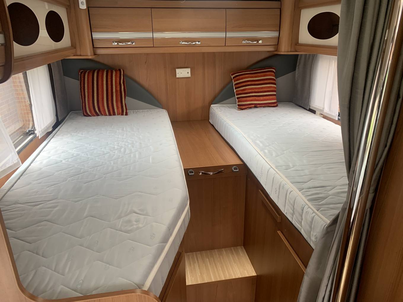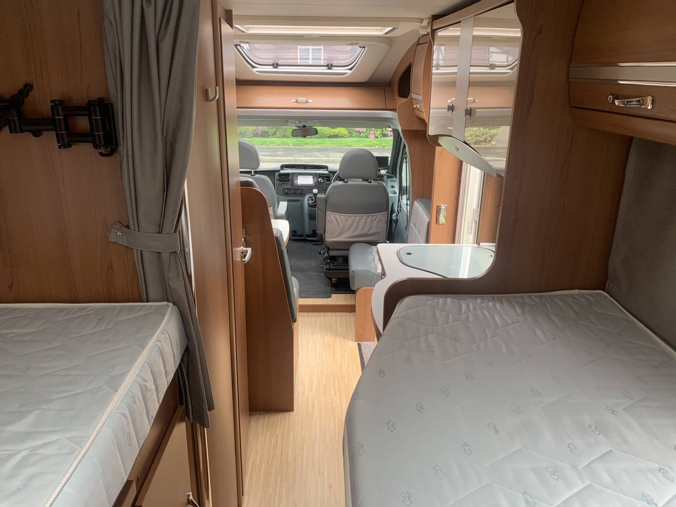 Starting with the rear of the motorhome, you have the elevated fixed twin beds that with the additional cushions also converts to a large king size bed. It is surrounded by multiple spot lights with plenty of storage space in the overhead cupboards. Underneath the bed is the large garage which has plenty of room to store items such as drive away awnings, bikes, luggage and many other items.