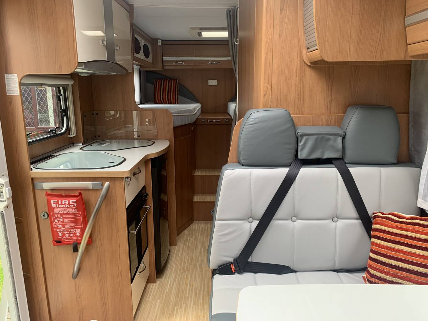 As we head towards the front of the motorhome, we come to the lounge/dining area where there are the rear two travelling seats with a further seat adjacent to it which together converts to the third bed or a small double for children. At the front there are driver and passenger seats that both swivel to face the large dining table that is positioned in between that offers that warm family dining experience.