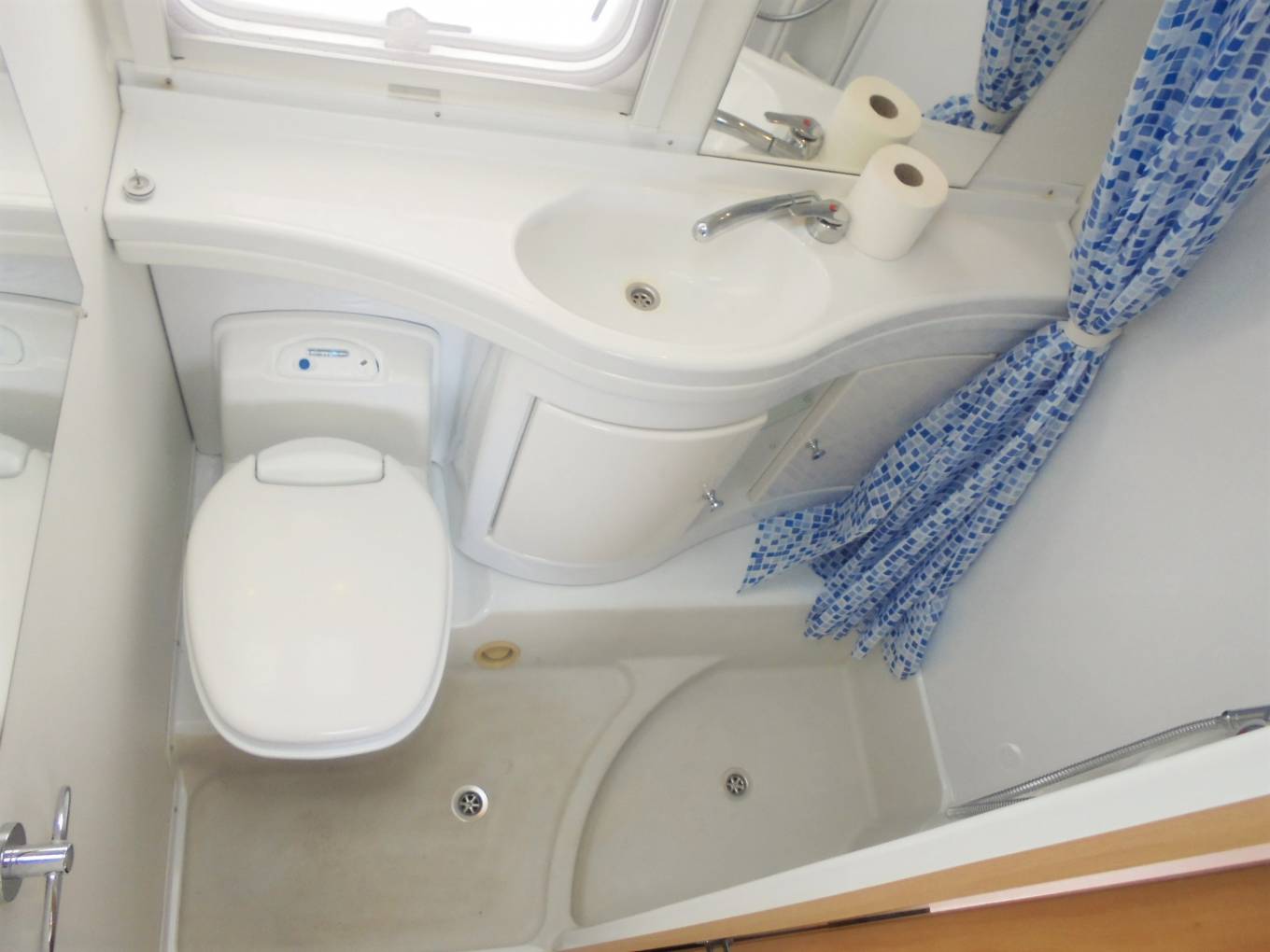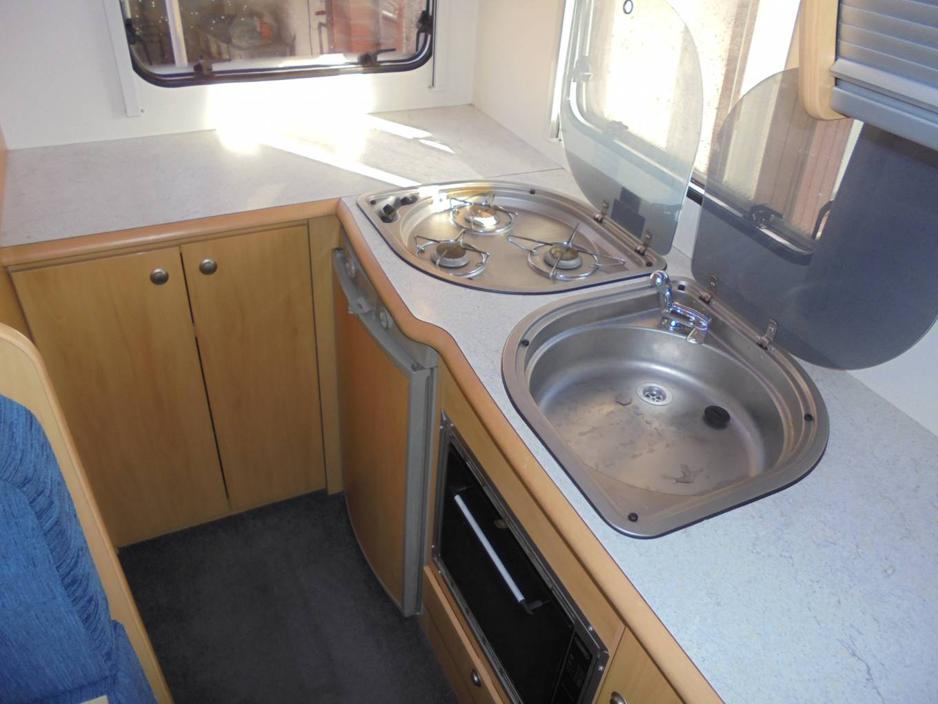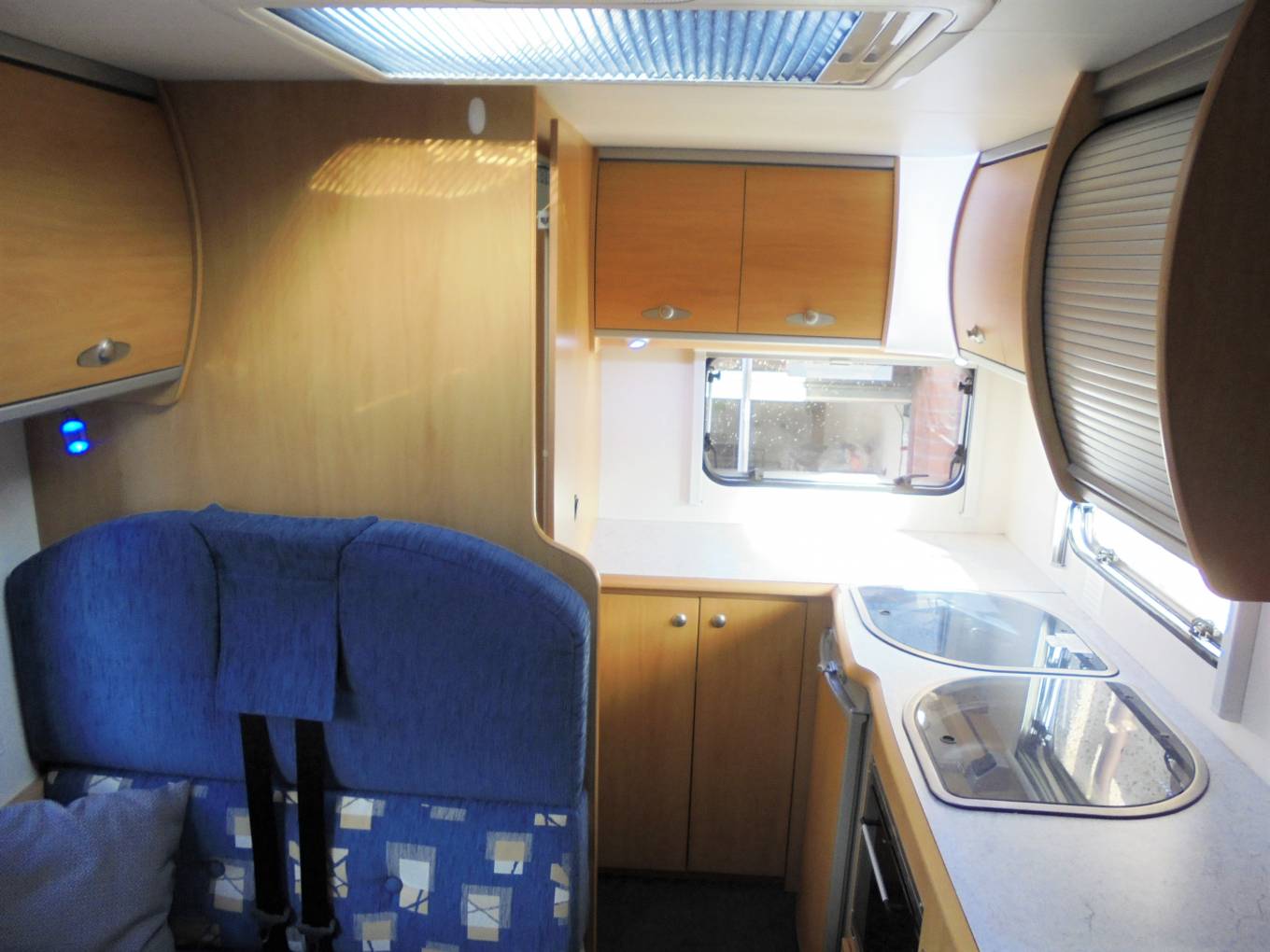 The kitchen area has a hob with 3x gas ring, sink, oven-grill combi and fridge with freezer compartment which operate on gas or electric. Heating and hot water operate on gas. The washroom has electric flush cassette toilet, sink and shower. The motorhome has a TV aerial, electric hook up, TV points, 230v and 12v power points and a TV bracket located within a cupboard in the lounge area. A TV DVD, levelling ramps, water filling hose and hook-up cable are included in the sale.