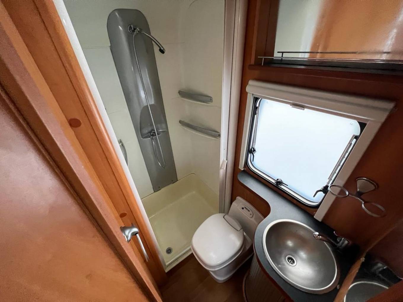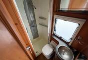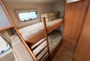 Starting at the rear of the motorhome you have the 2 bunk beds which are perfect for a family with young children. Underneath the bunk beds is a large storage area which can be accessed via an external locker. Opposite these is the highly desirable end washroom layout featuring a separate shower with screen, a toilet, a wash basin with mixer tap and storage cupboards.