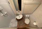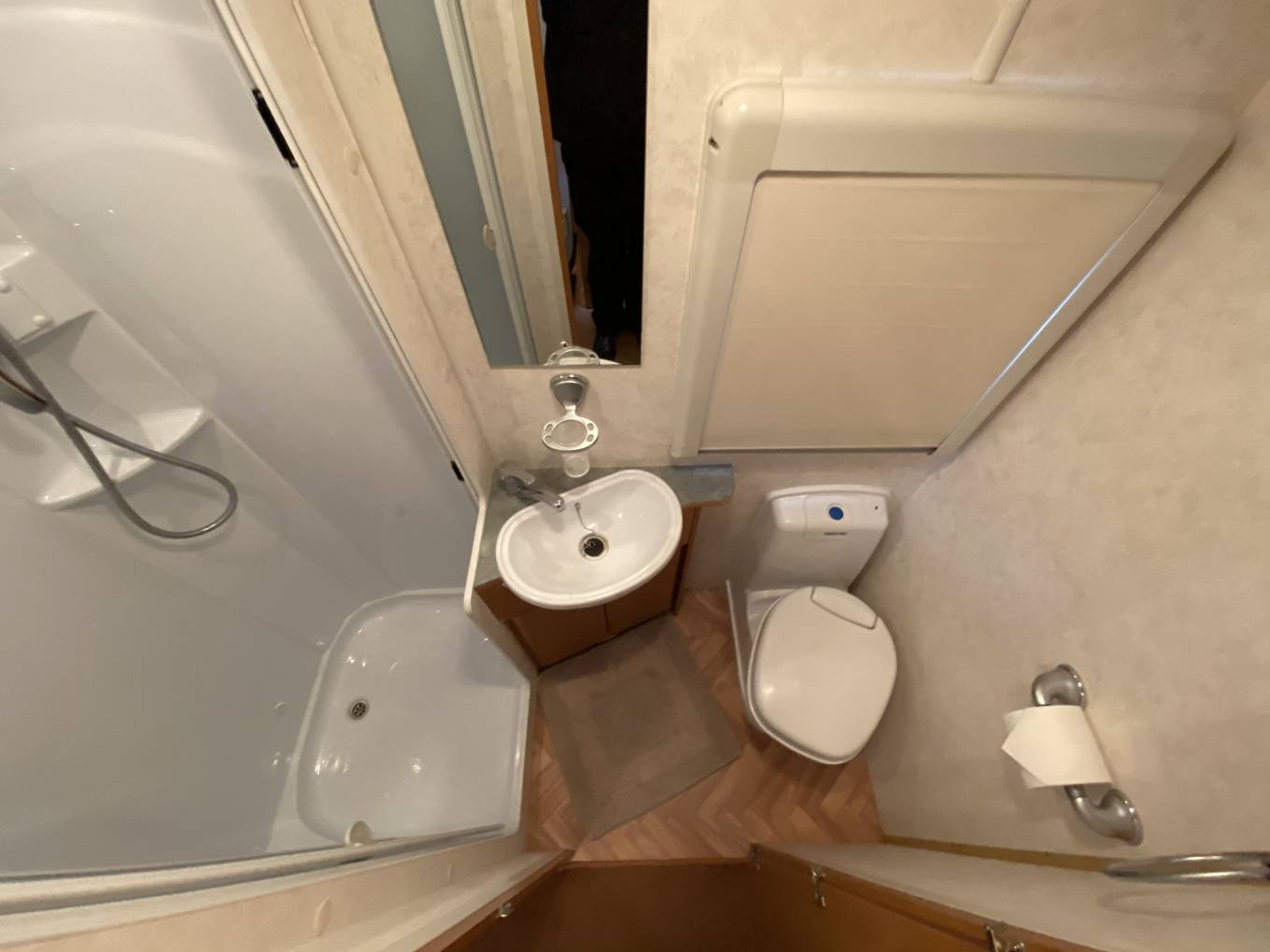 Opposite the flyscreen protected entrance door is the bathroom containing a Thetford swivel bowl toilet, a wash handbasin, a separate shower and cupboard space.