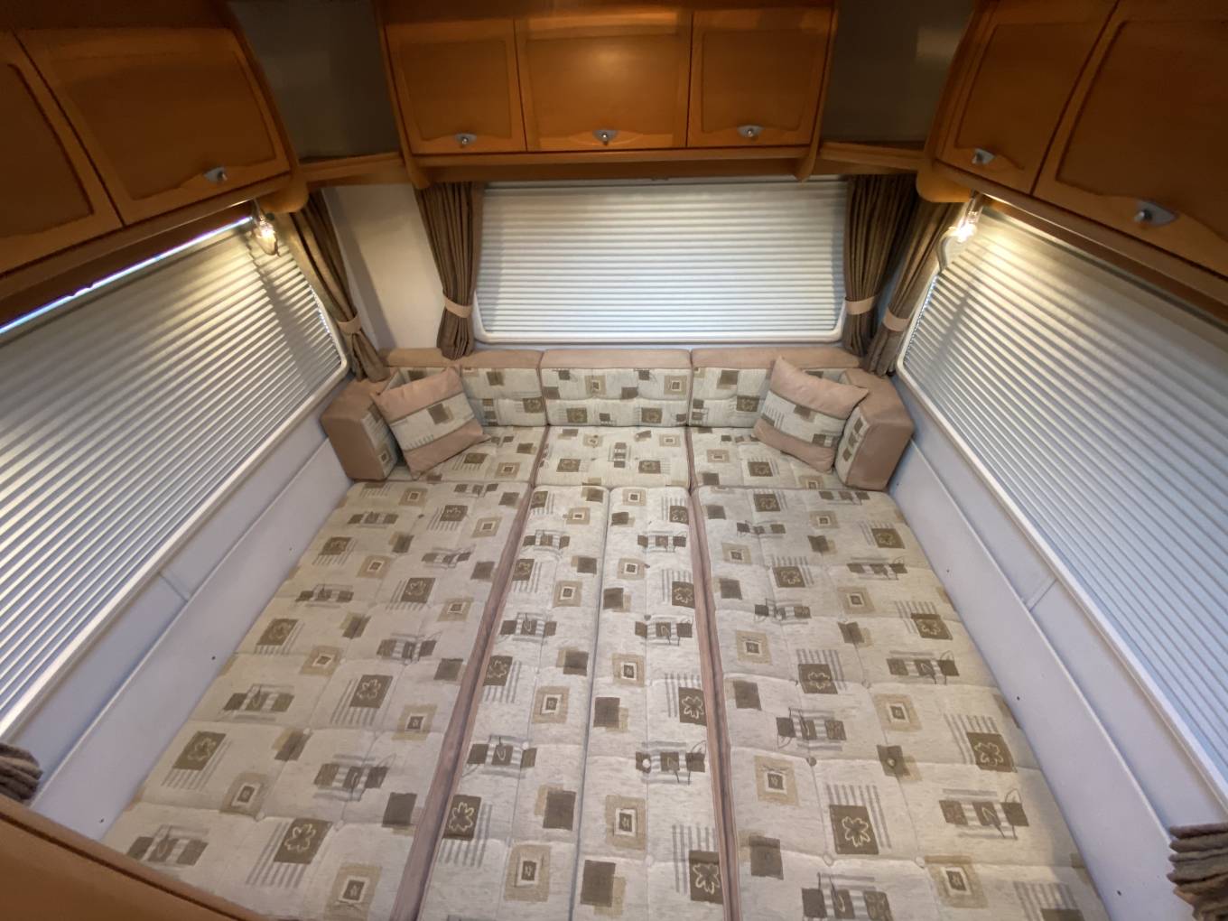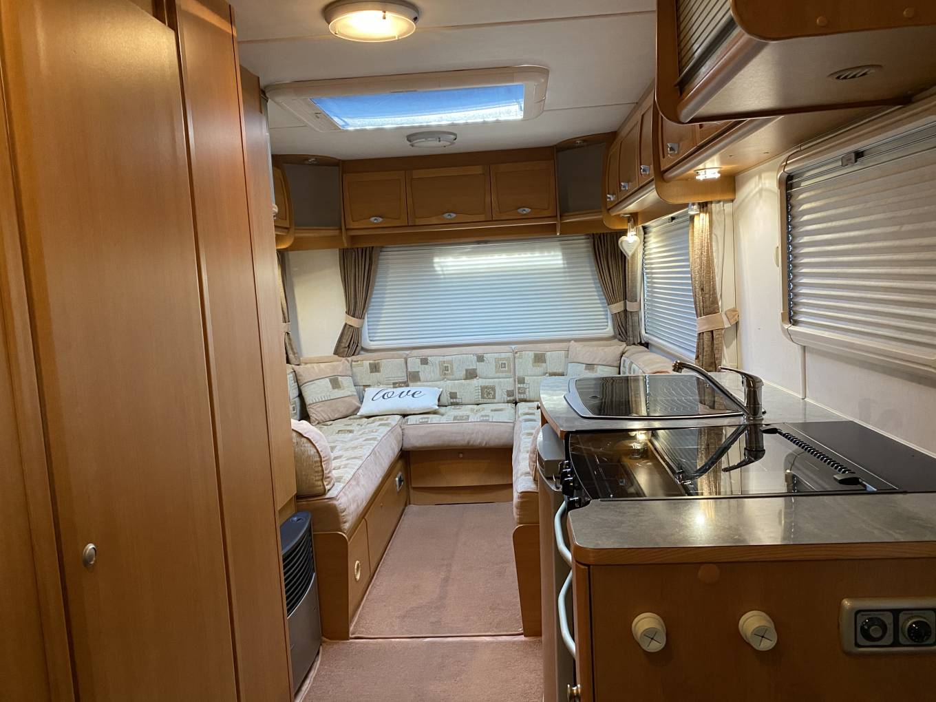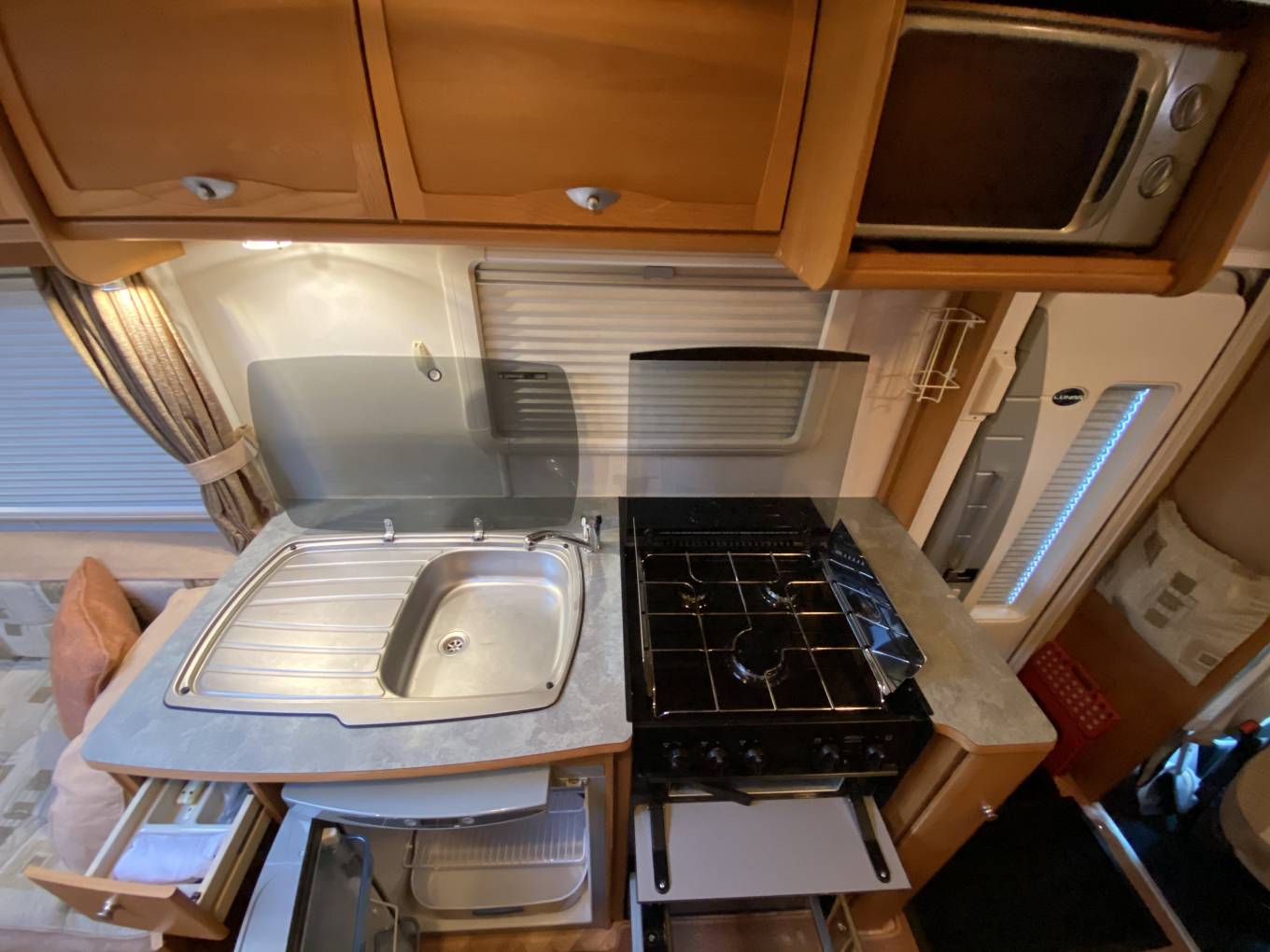 To the right as you enter is the comprehensively equipped kitchen where you will find a three burner hob, a separate oven and grill, a three energy source Thetford fridge, a Microwave Oven, a sink with drainer and plenty of cupboard space. Above is an extractor fan.