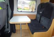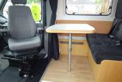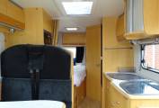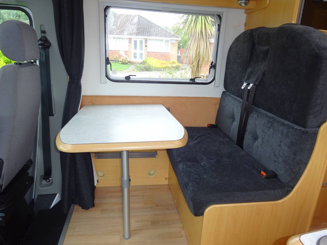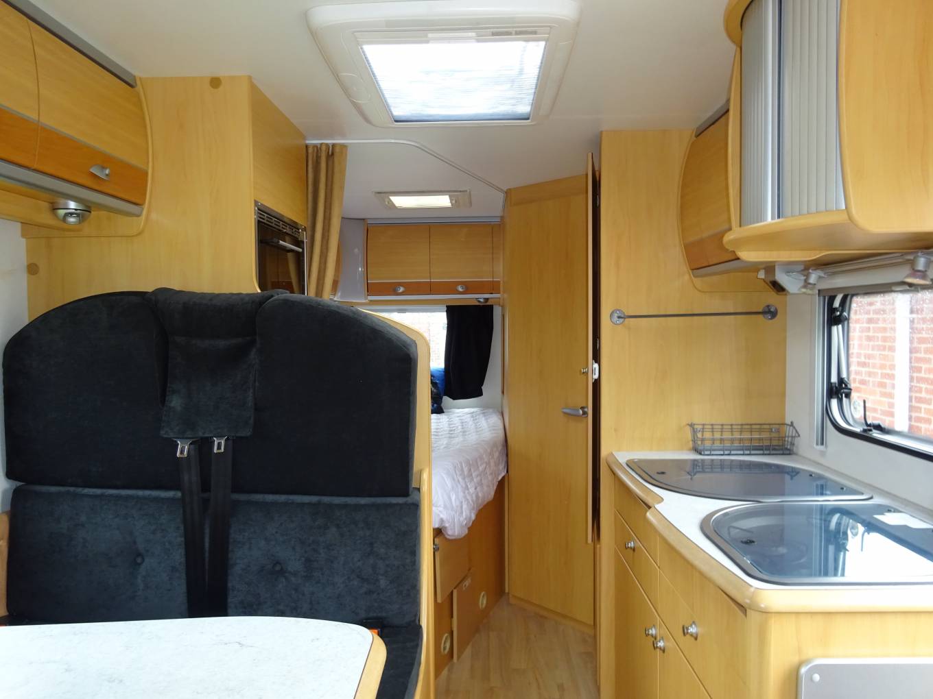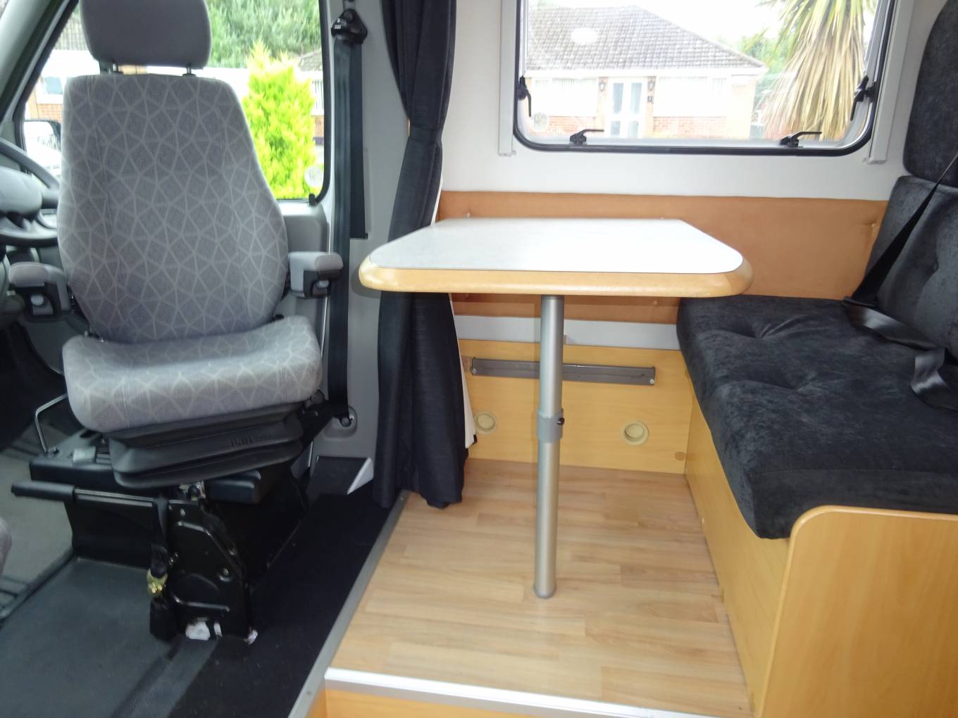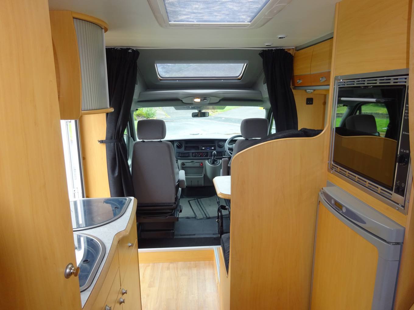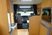 A tambour cupboard houses the TV DVD which is included. A Status aerial is fitted. In the living and dining area the forward-facing seat houses the 2 x three point seatbelts. The table lowers to form the base of the third berth, filler pieces are normally stored in the rear garage. Both driver and passenger seats swivel to the lounge area. These seats are worth a mention, modern looking Isringhausen units with front and rear height adjustment and adjustable armrests on both.