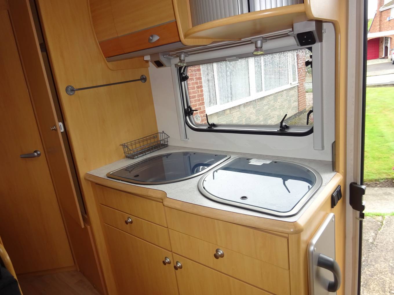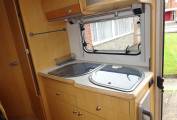 The main cabin has a sunroof with blackout cover and Heki light with covers giving plenty of natural light. On one side the central kitchen has the large fridge with separate freezer with combined grill, oven and a rotisserie above. On the nearside is the sink next to the three-ring gas hob. Both with glass covers. Cutlery drawers and good size cupboards are underneath.