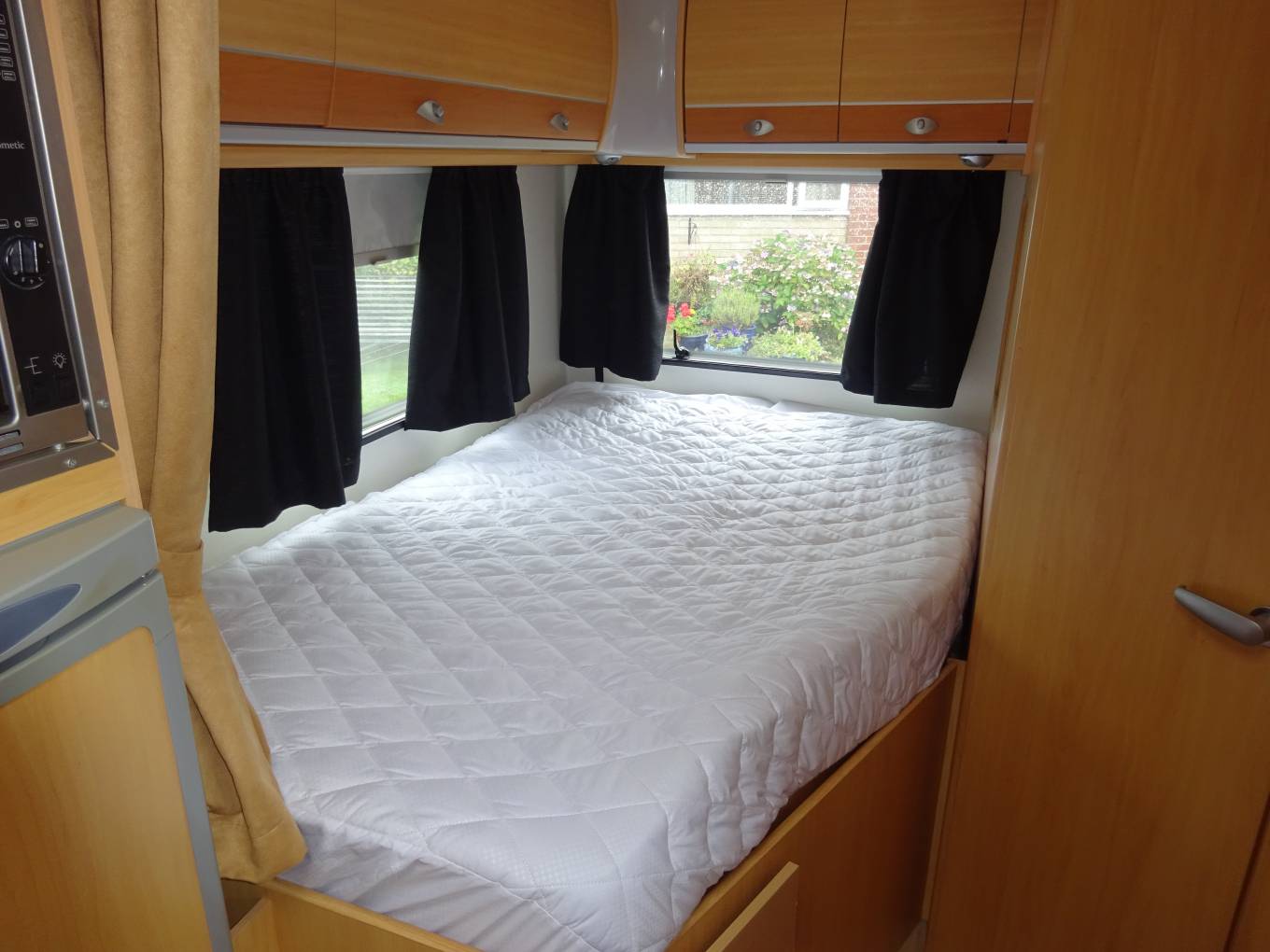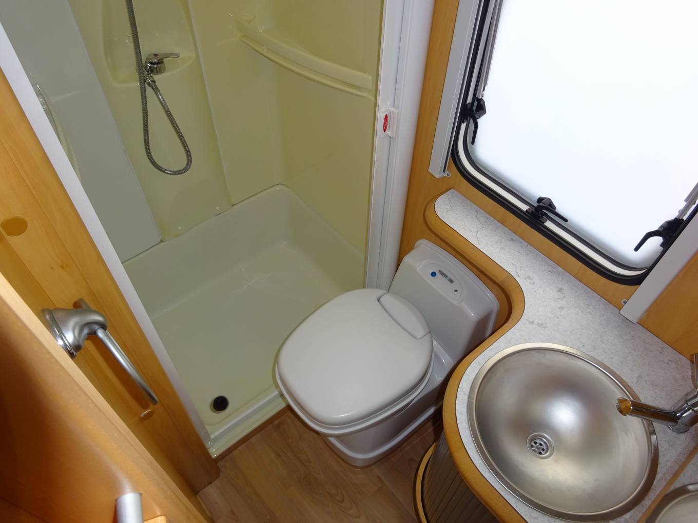 Next to the bed is a good size washroom featuring shower with slide out door to separate the toilet and sink. There are mixer taps a towel ring good shelving space below the sink and a vanity mirror with shelf and cupboard above, further storage is found on the back of the washroom door.