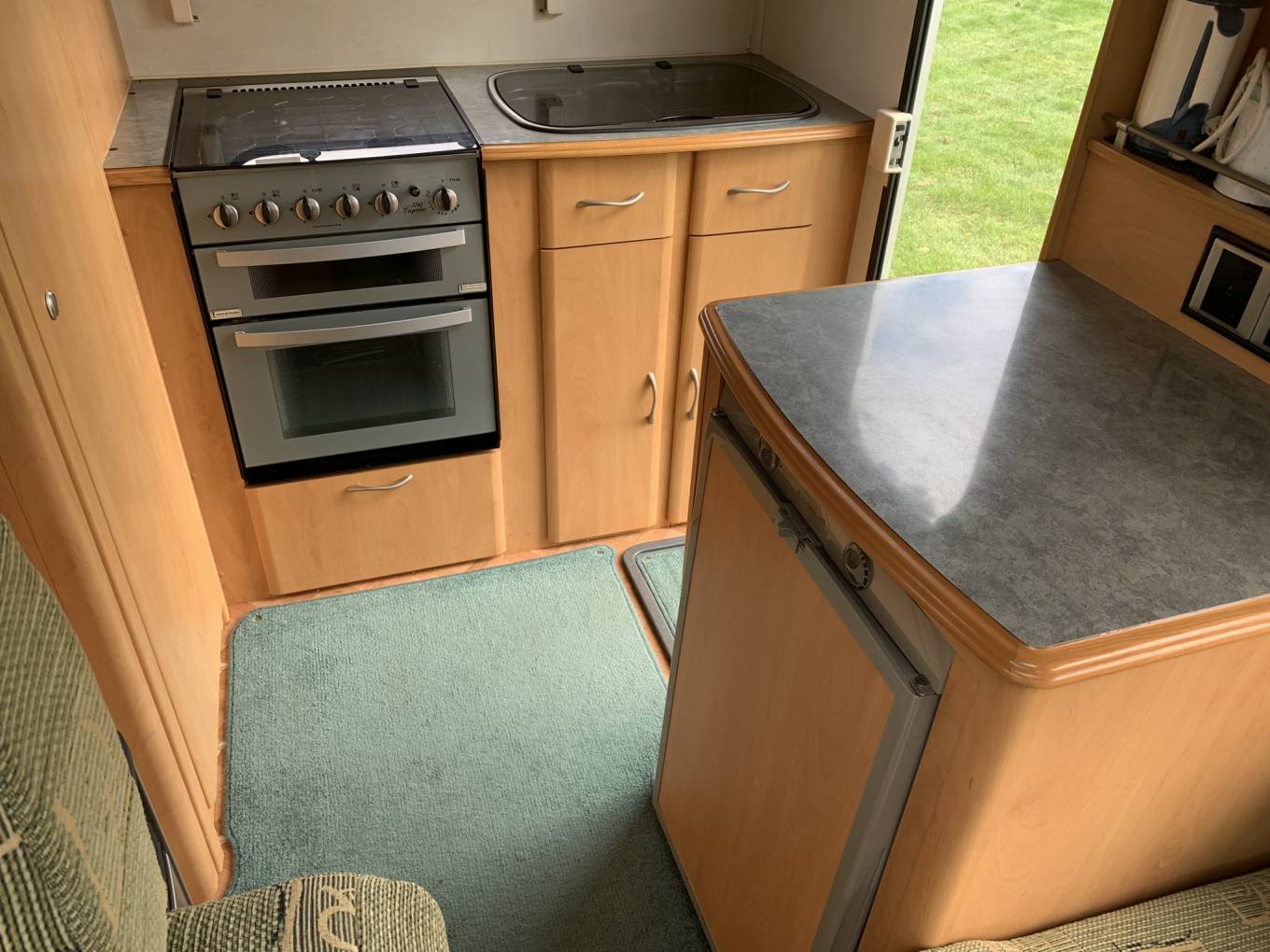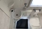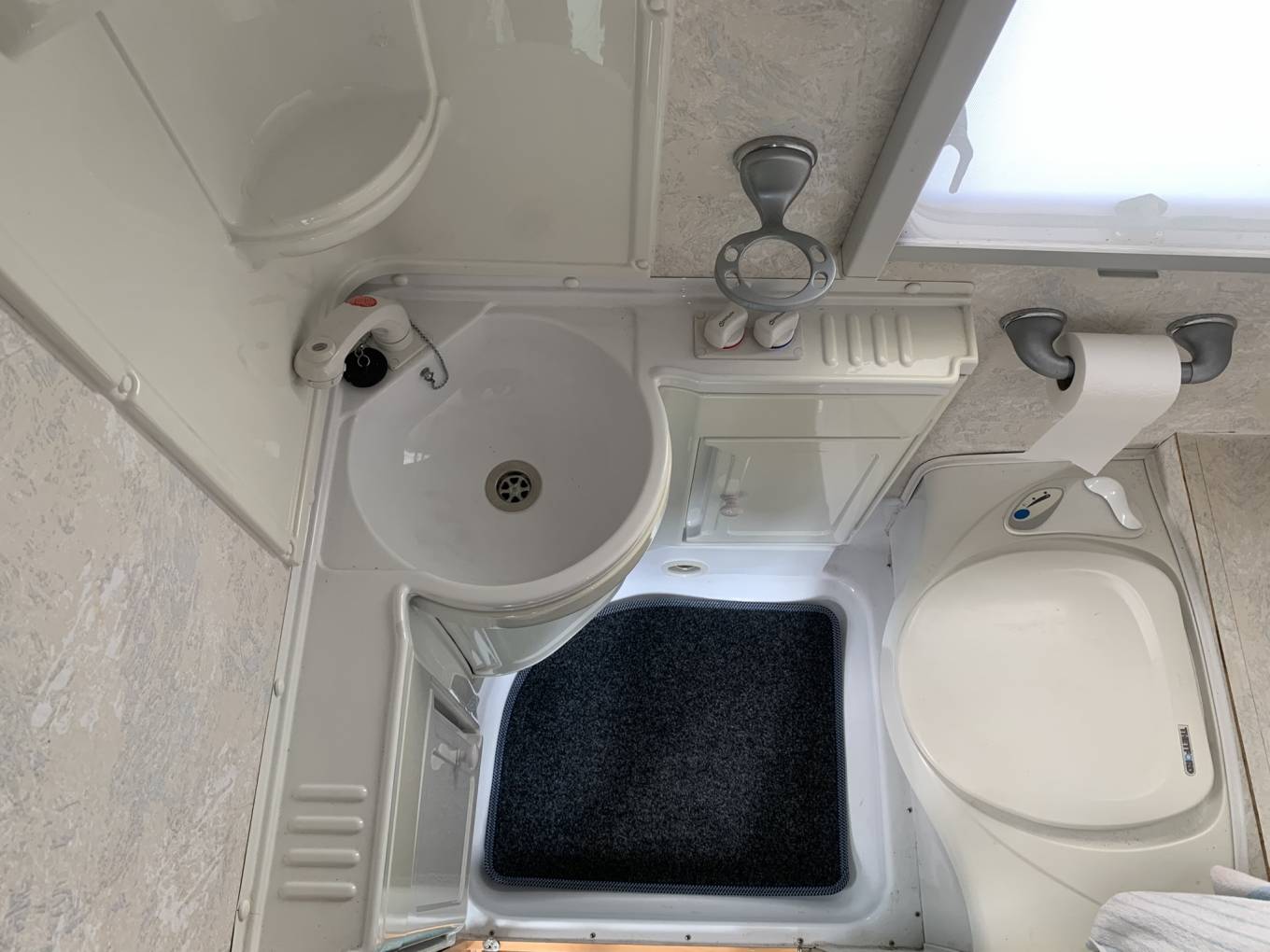 The layout of this motorhome is rear kitchen and washroom with over cab bed. Starting with the kitchen where there is a large Caprice 2040 oven with grille and 4 way gas hob, sink with storage overhead and underneath and a Dometic fridge with freezer compartment. Also at the rear adjacent to the kitchen is the washroom which includes a Thetford cassette toilet, sink with hot and cold taps and separate shower head. Also in this area is the Trumatic heater.