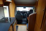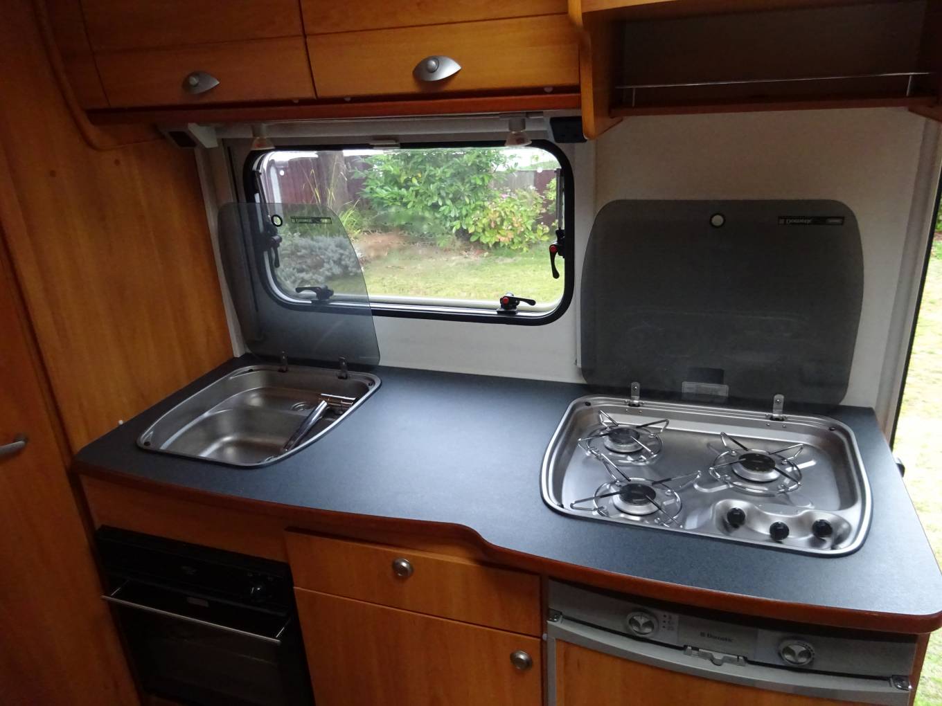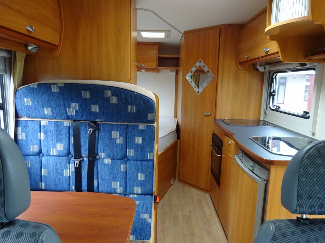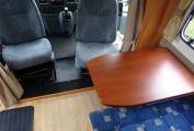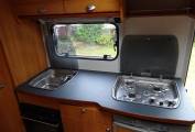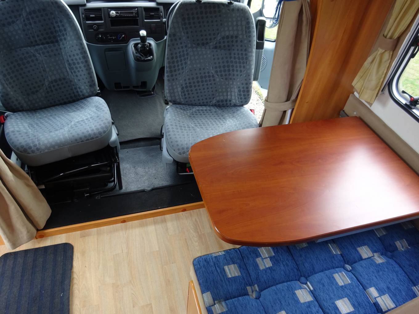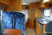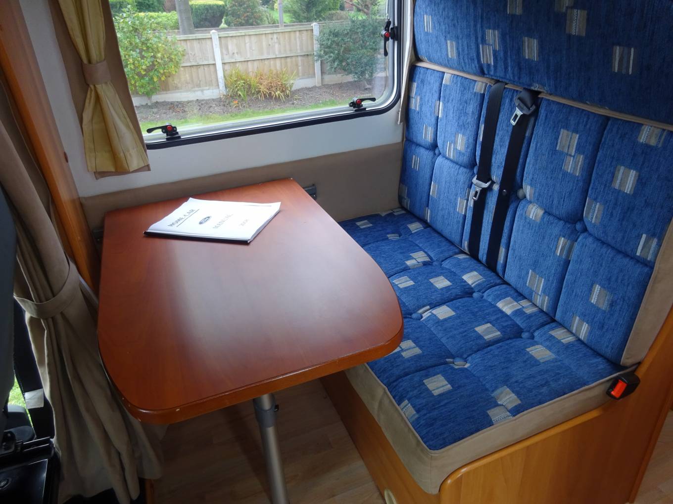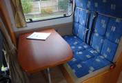 As you enter the motorhome you see the dinette with the extendable table. The travelling seats are trimmed in a modern blue coloured fabric. The travelling seats have two 3 point seat belts. Both front seats swivel to face the table when required. The kitchen is located in the centre of the van and features 3 ring gas hob and sink with mixer tap in the worktop. The gas oven and grill are below along with the fridge with freezer compartment. All very clean and tidy with good cupboard space. A Truma Trumatic C boiler provides hot water and heating. The Avtex TV is included in the sale and has a swivel bracket that slides out and is adjustable. Neatly housed in its own cupboard with tambour door.