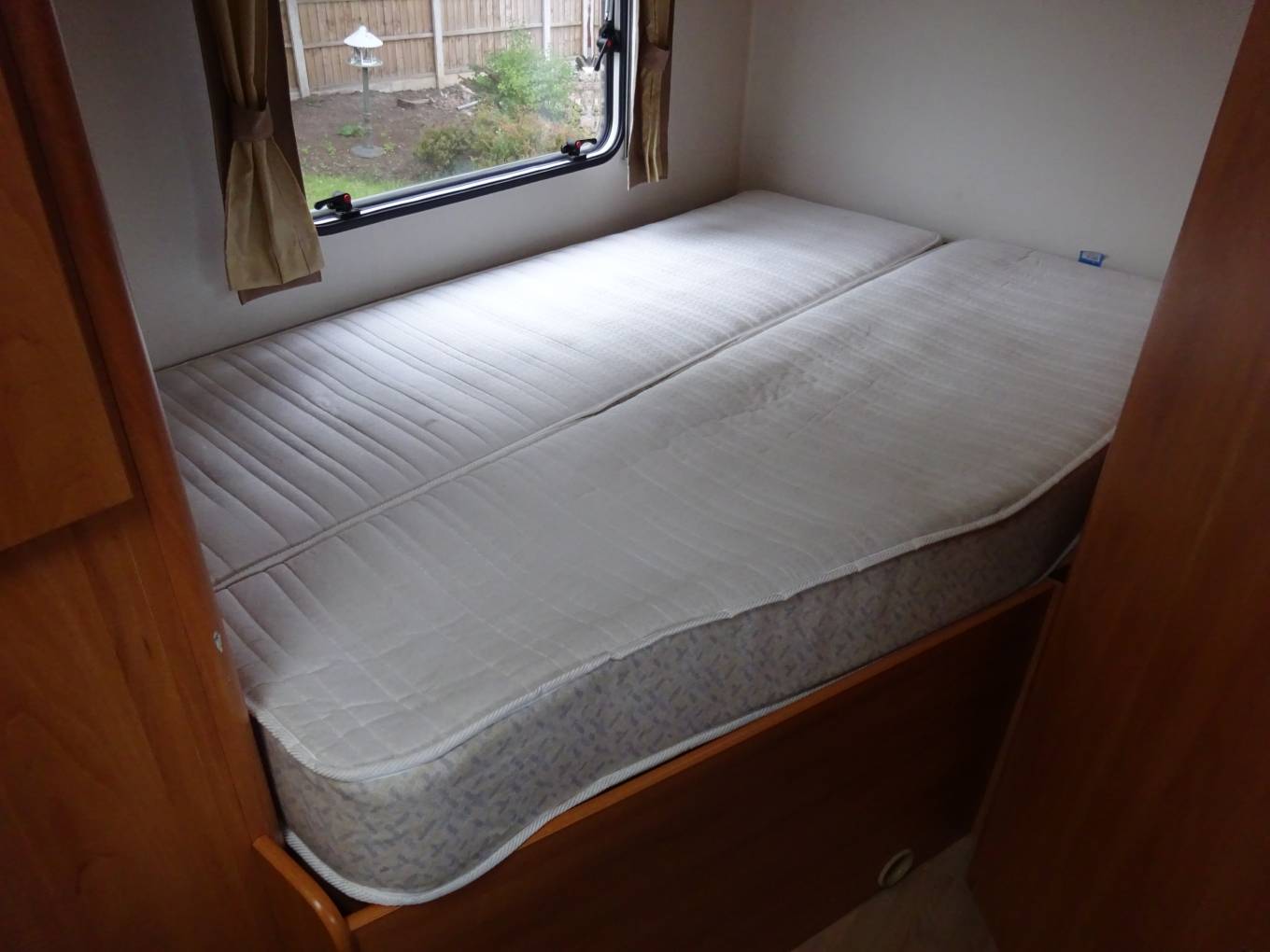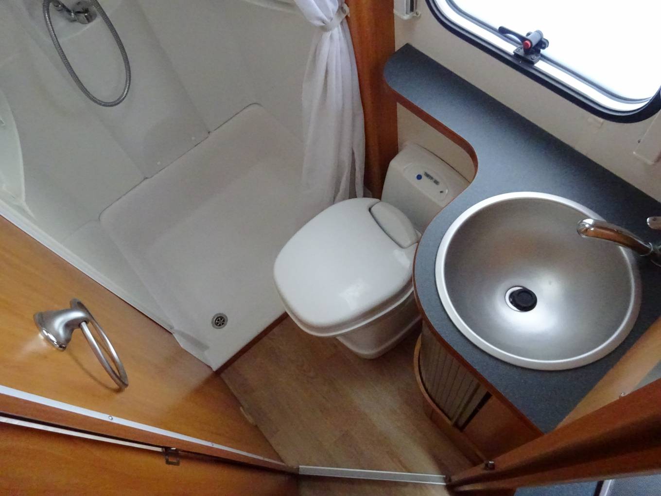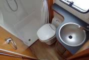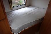In the washroom the shower is separated from the toilet and hand basin by a shower curtain. The toilet is the usual Thetford unit. There is good storage space under the basin and a vanity mirror reflects light from the side window and roof light to make it a well-lit space to wash. The wardrobe provides hanging space and is located next to the fixed rear bed. The bed itself has two separate mattresses and lifts to give access to the rear locker space. Above the bed are a mix of cupboards and shelves for storage.