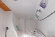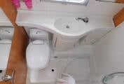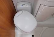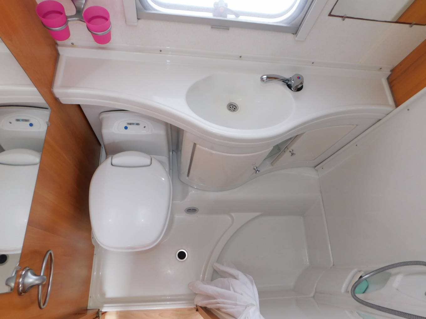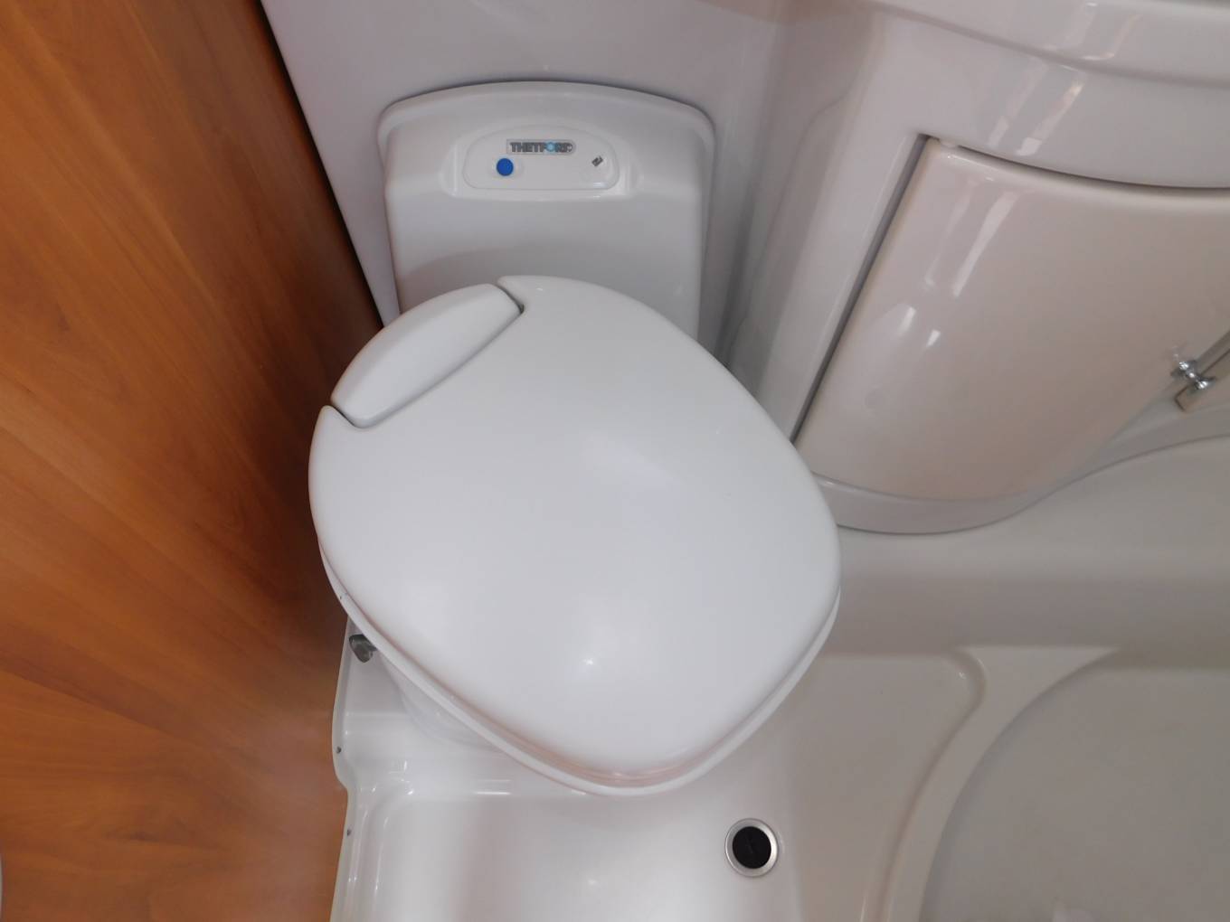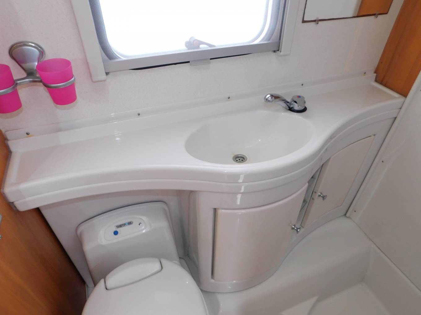 The washroom is large with a shower tray and rising rail, shower curtain and a good sized built-in washbasin with chrome mixer tap and double cupboard beneath plus a Thetford cassette swivelling toilet with electric flush.
