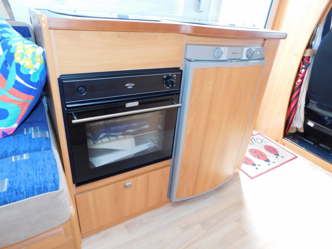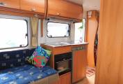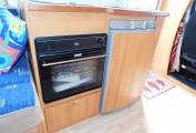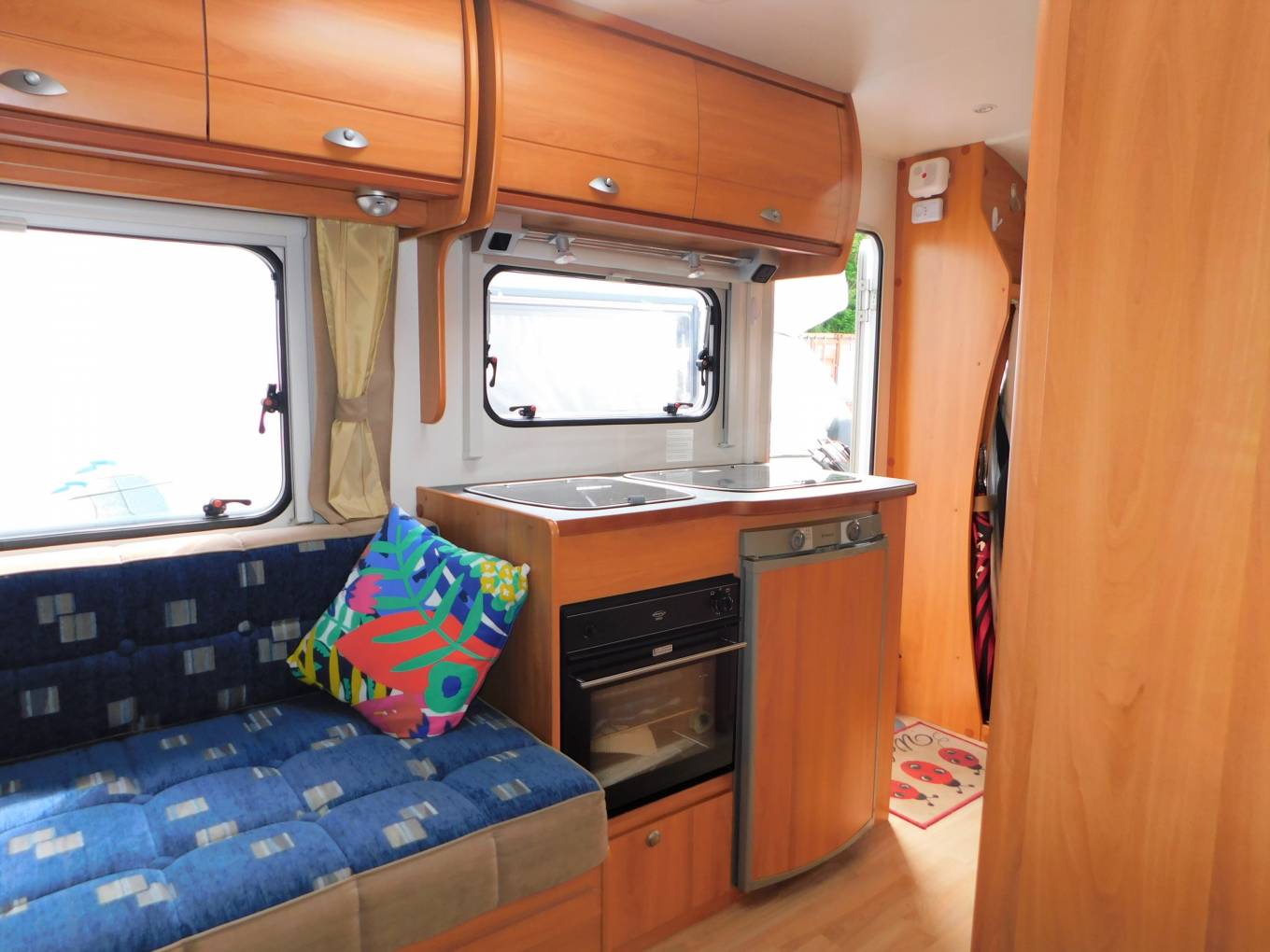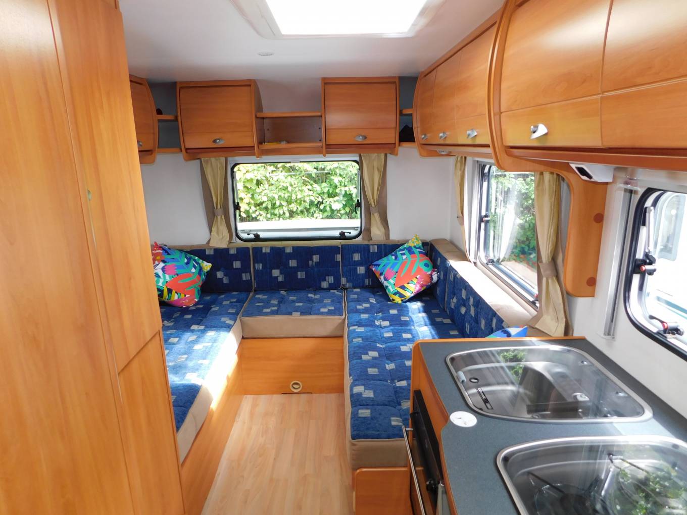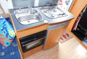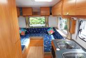 Step inside and you have the kitchen on your right, with a stainless steel sink with chrome mixer tap and glass lid, a stainless steel hob with three gas burners and a glass lid, Spinflo Duplex gas oven and grill, Domestic three-way powered fridge with ice-box and plenty of upper and lower cabinets to store away your holiday provisions.