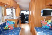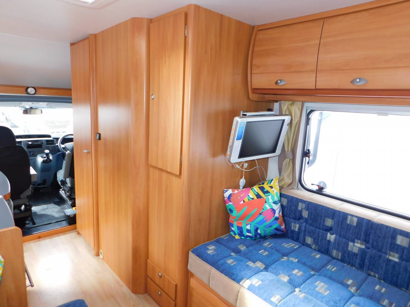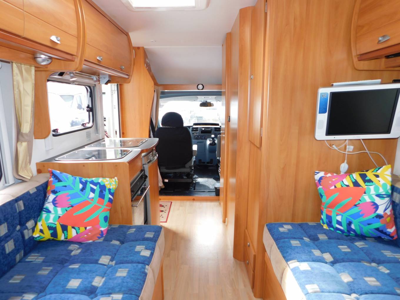 The main feature of the motorhome is the u-shaped rear lounge, this area can be used as two single beds or pull out the slats to make an extremely large double bed that will accommodate the tallest of adults. Upper aircraft style lockers provide plenty of storage, plus under the near side sofa is a large storage area that can be accessed by lifting the sofa, or accessed via an external locker door.