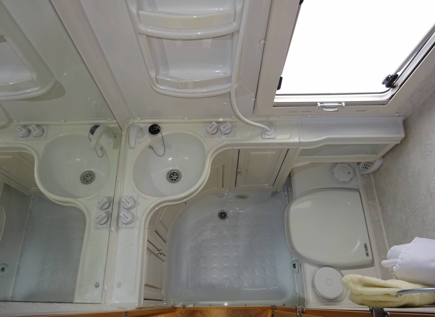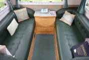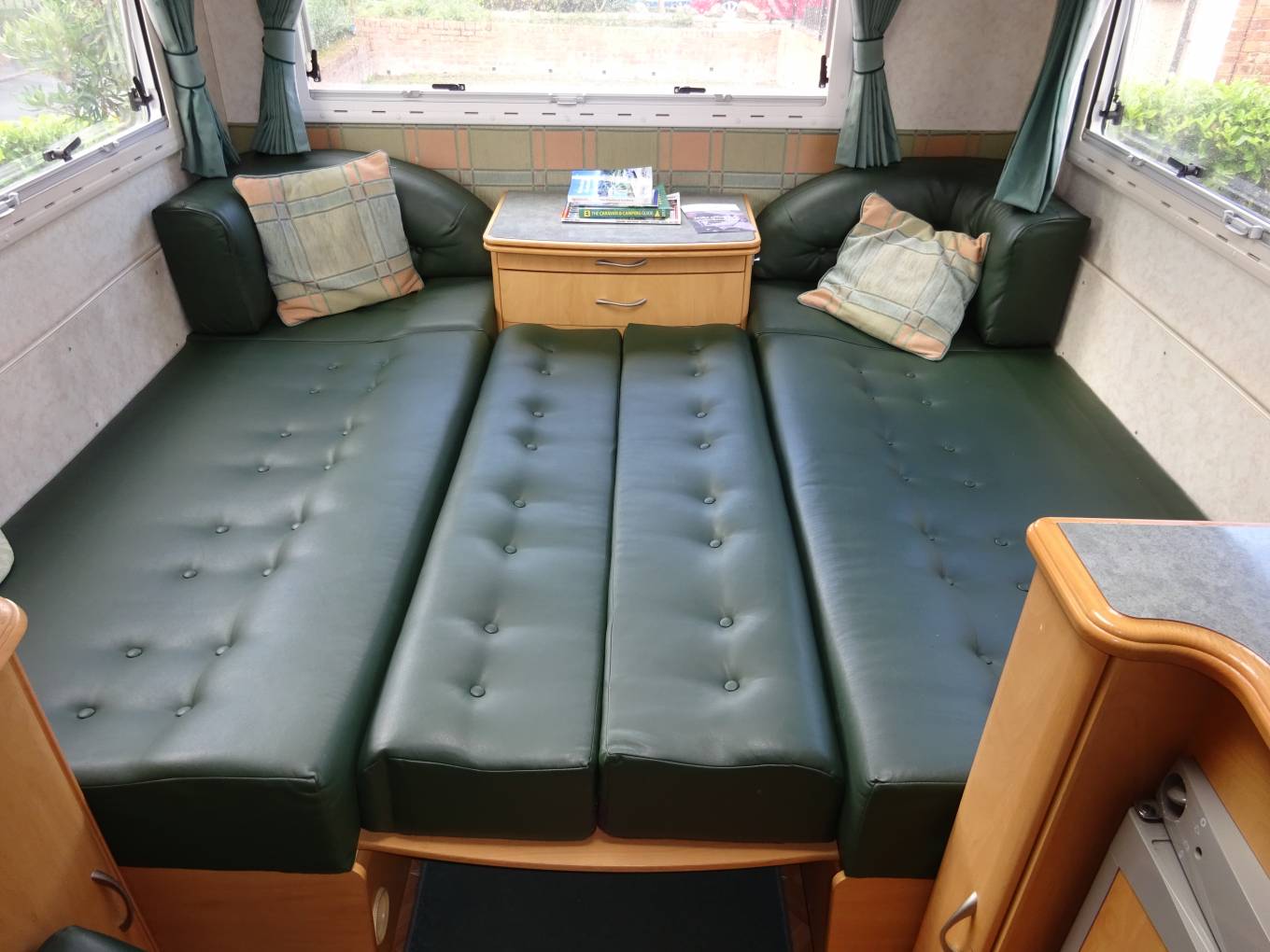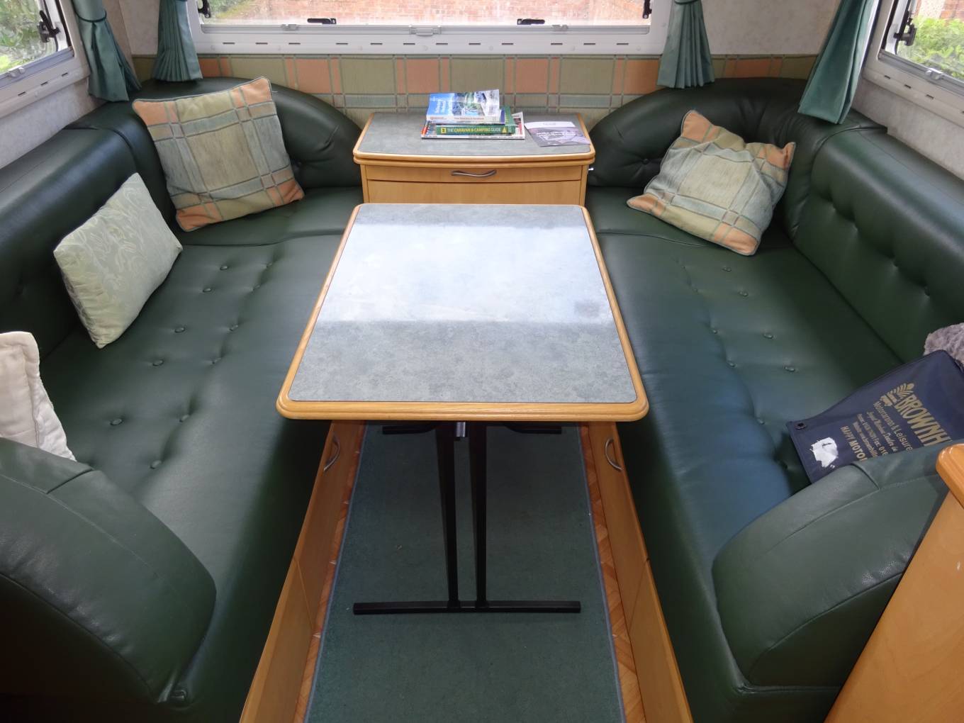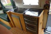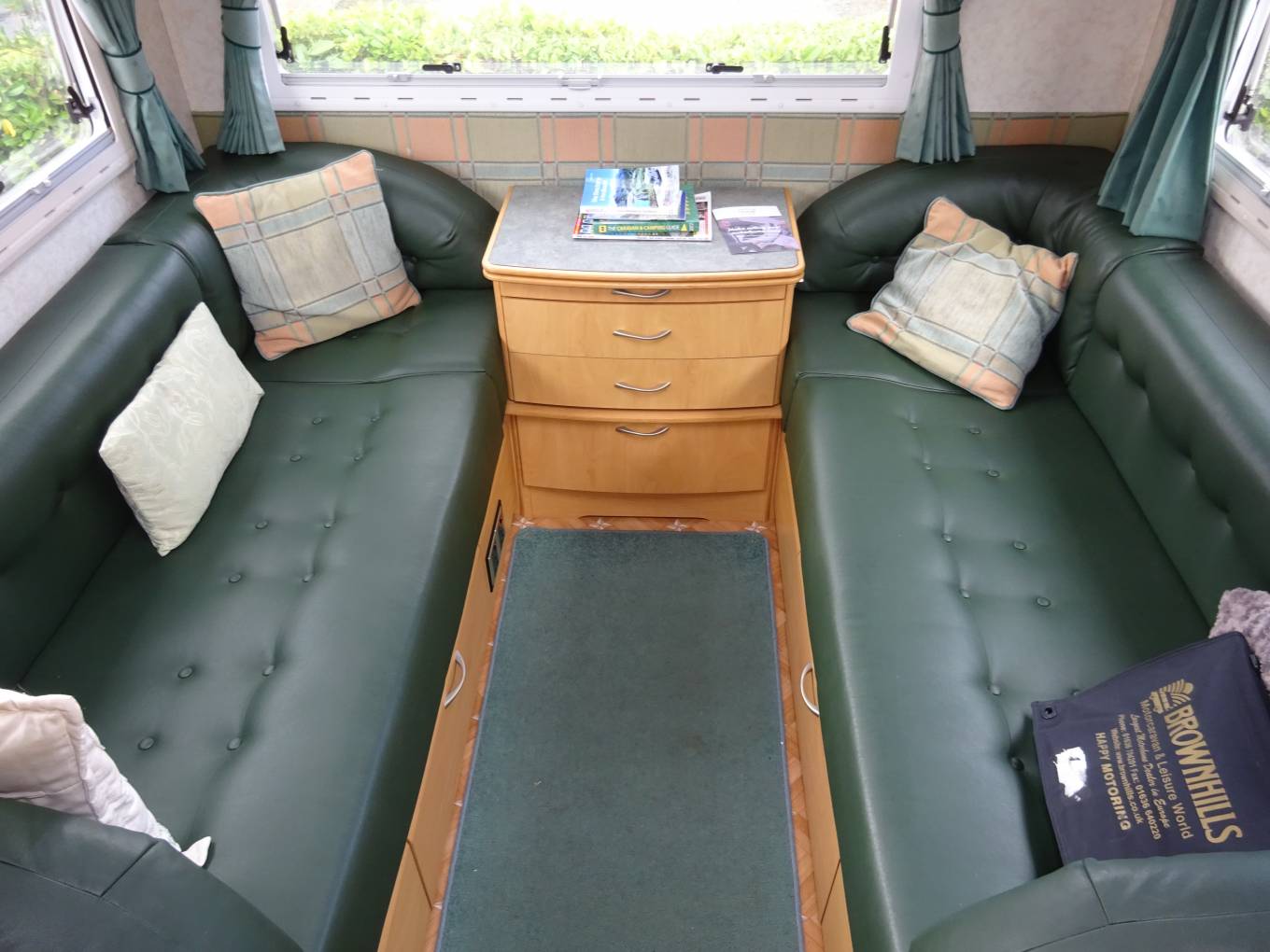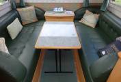 The free standing dining table sits between the sofas and has a dedicated storage space when not in use. The kitchen is clean and tidy with a Caprice 2020 cooker with grill, oven and 4 ring gas hob. The sink with draining board sit under a glass cover or worktop. The three way Electrolux Dometic fridge with freezer compartment sits under the sink. Ther are large cupboards above the kitchen window and a pull out worktop as well as cutlery draw and two lower cupboards.