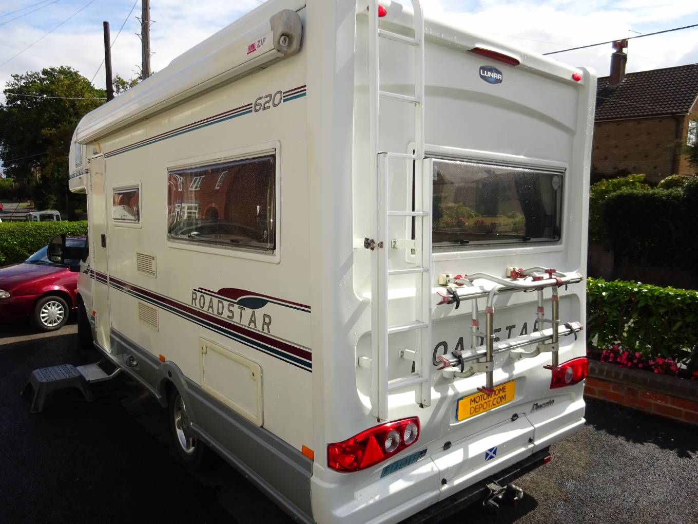 We present for sale a Lunar Roadstar 620. It has a rear lounge layout with the kitchen and washroom located centrally. The rear sofas can be used as two single beds or pull the support slats from the drawer unit to easily create a double bed using the fill in pieces. The seating is believed to be leather covered. The lounge area has a window on each side as well as a rear window to give a light spacious feeling. The other double bed is above the cab, accessed using the clip on metal ladder provided. There is a window on each side of the bed and a safety net.
