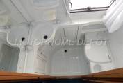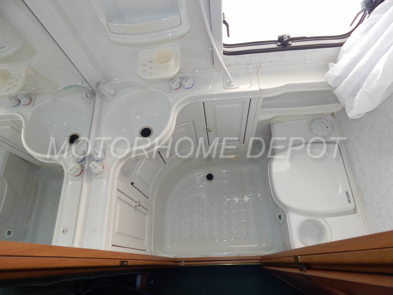 The washroom has a clever door that will open to section off a private area for dressing, inside is a good sized shower tray, a built-in washbasin with mixer tap, a Thetford cassette toilet and a riser rail with shower handset. Opposite the washroom is a large wardrobe with hanging rail, the stored dining table, plus a bottom locker.