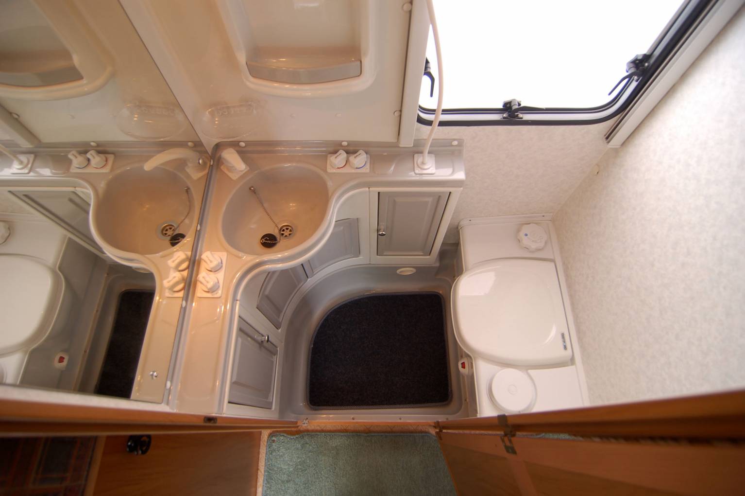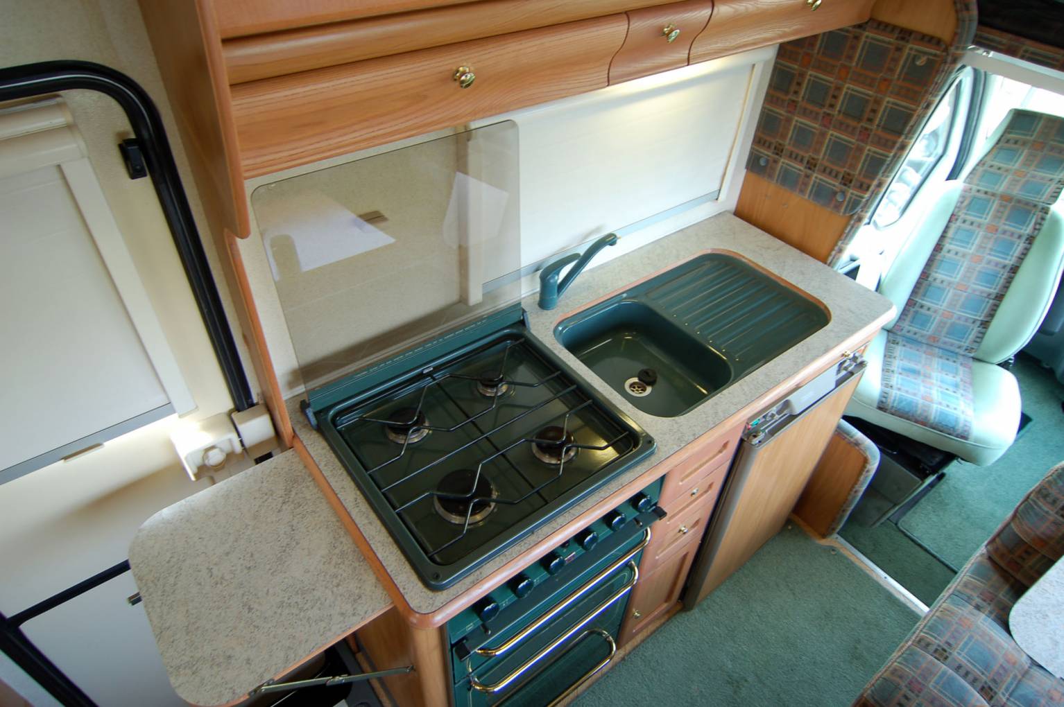 Facilities include gas hob, oven, grill, 3 way fridge, dual fuel hot water and heating. Storage is copious with split top lockers, large centre wardrobe, low level storage lockers and rear underbed storage with external access. Sleeping arrangements comprise of overcab bed, forward dinette bed and rear lounge bed, so maximum of 3 doubles, the largest from the rear lounge. Outside there is a large fitted Fiamma awning, roof rack and ladder. Based on the rugged Fiat Ducato 2.8 turbodiesel engine, this motorhome has MOT until March 2019 with no advisories, good tyres all round and new habitation battery.