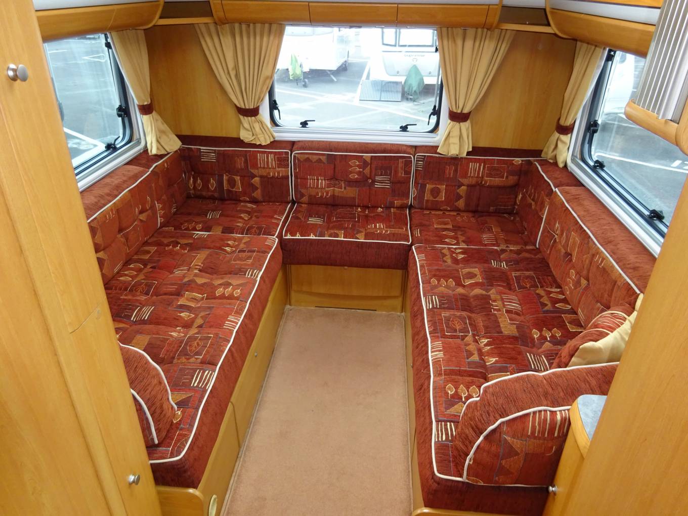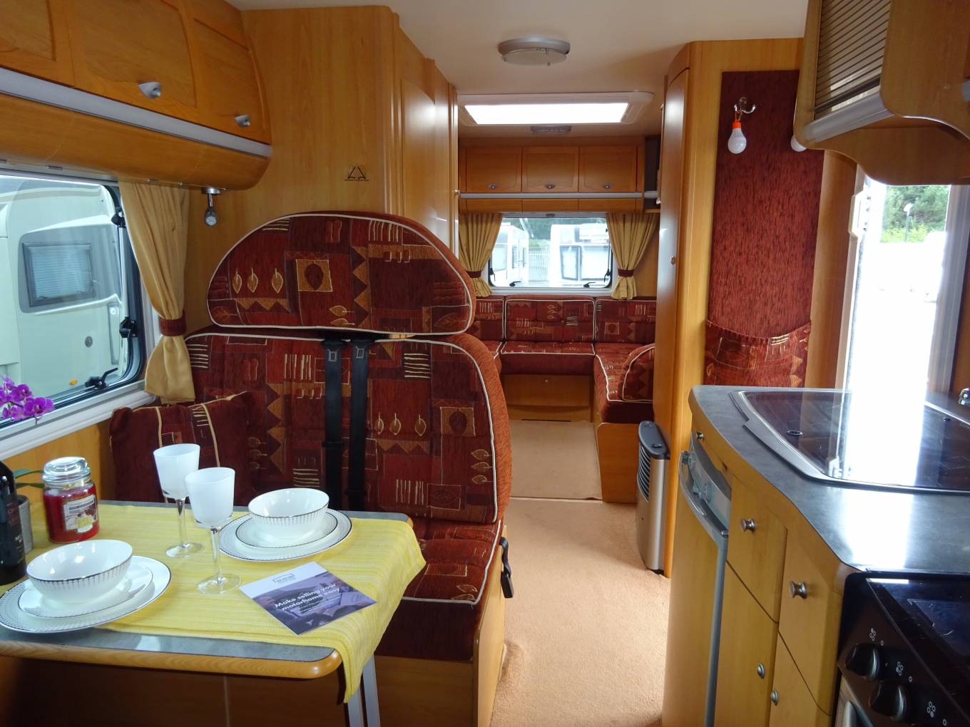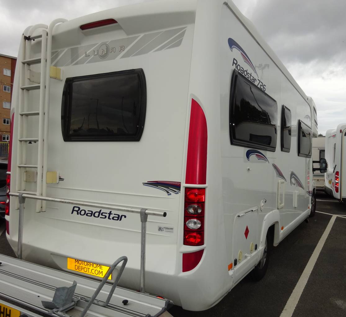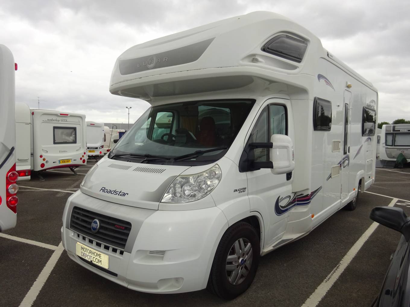 MotorhomeDepot.com Chester and Wirral present for sale this this 2007 Lunar Roadstar 726, 6 berth motorhome. (57 reg but on a private plate that goes with the motorhome). The layout is with a U shaped rear lounge, a central dinette and kitchen with an over cab bed.There are two three point seat belts on the forward facing dining seats to give a total of 4 travelling seat belts. As you enter through the habitation door the kitchen is on the left, features include full size Spinflo oven, hob wth 3 gas burners and electric hotplate, extractor fan, microwave oven in upper cupboard, sink with built in draining board, 3 way Dometic fridge with freezer compartment, plentiful storage, glass lift up worktops, pull out worktop. The dining area seat 4 in comfort then converts to a 2.01 m x 1.48 m bed when needed. The over cab bed is 2.09 m x 1.40 m. Both front seats swivel around. Heating is gas or electric Truma Ultraheat system. Water heater is Truma Ultrastore gas or electric. There are Remis blinds and flyscreens with flyscreen on hab door. Washroom is well sized with bench style Thetford cassette toilet, corner sink, vanity cupboards and mirrors, shower unit. A tall wardrobe gives hanging space the Status TV aerial is in there too. An Oyster vision Satelite dish is fitted. TV is NOT included. The carpets shown are the original with press stud fixings so can be removed easily. The interior of this motorhome has been really well kept and is in lovely condition.