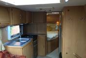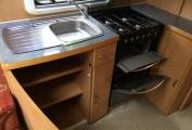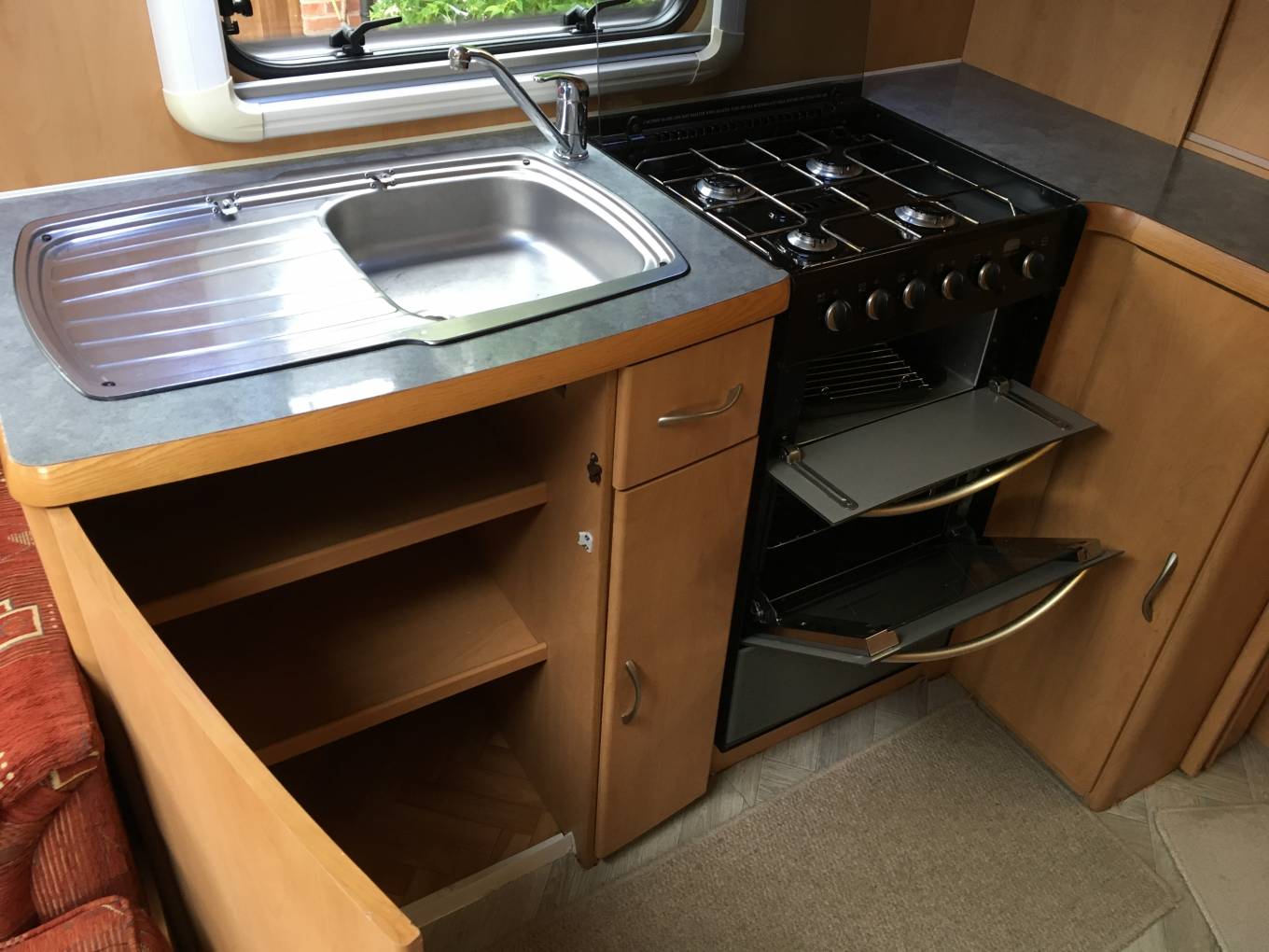 Enter through the habitation door via the electric step and you have the kitchen in front of you, with a large stainless rectangular sink with drainer and chrome mixer tap, a four gas burner hob and below a grill and separate oven. There is also a 3 way powered Dometic fridge with separate freezer unit above and a variety of good-sized storage cabinets throughout.
