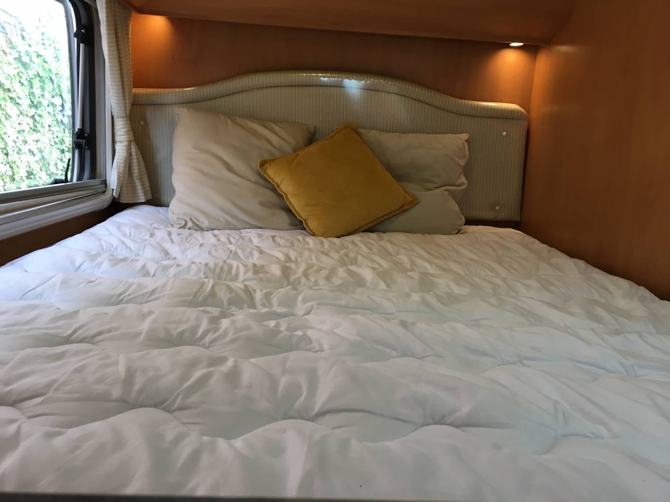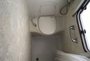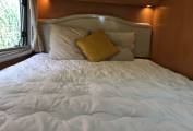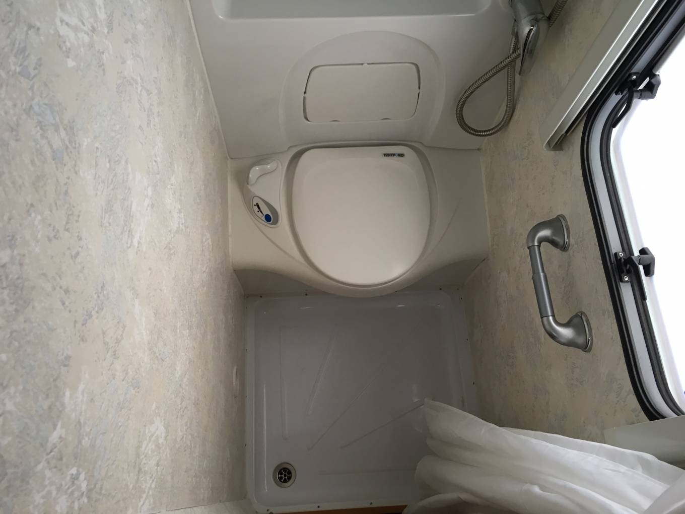 The good sized corner washroom has a integral shower cubicle and Thetford cassette toilet with an opaque opening window. Adjacent is the separate ensuite wash area with wash basin, mirror and cabinets. Next to here is is the generous sized French double fixed bed with panoramic side window and overhead reading lights above and plenty of overhead storage lockers.There is a further large double bed option over the cab area.