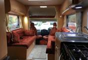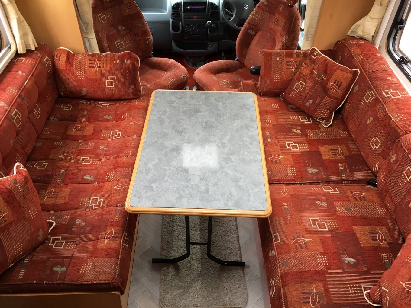The lounge has two long comfortable facing sofas and there are upper lockers and under seat storage available. There is a good sized freestanding dining table that stores away.The living area is well lit with natural light and has an airy feel with a large opening skylight above. The front cab passenger and drivers seats both easily swivel round to face the living space, offering additional seating for either relaxing or entertaining.