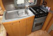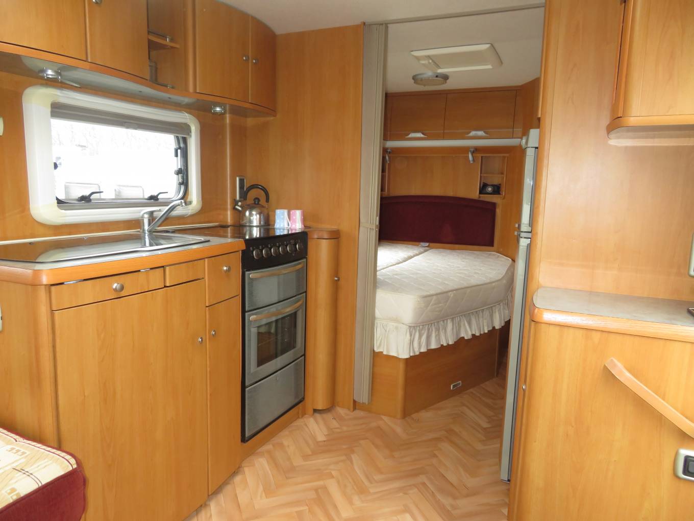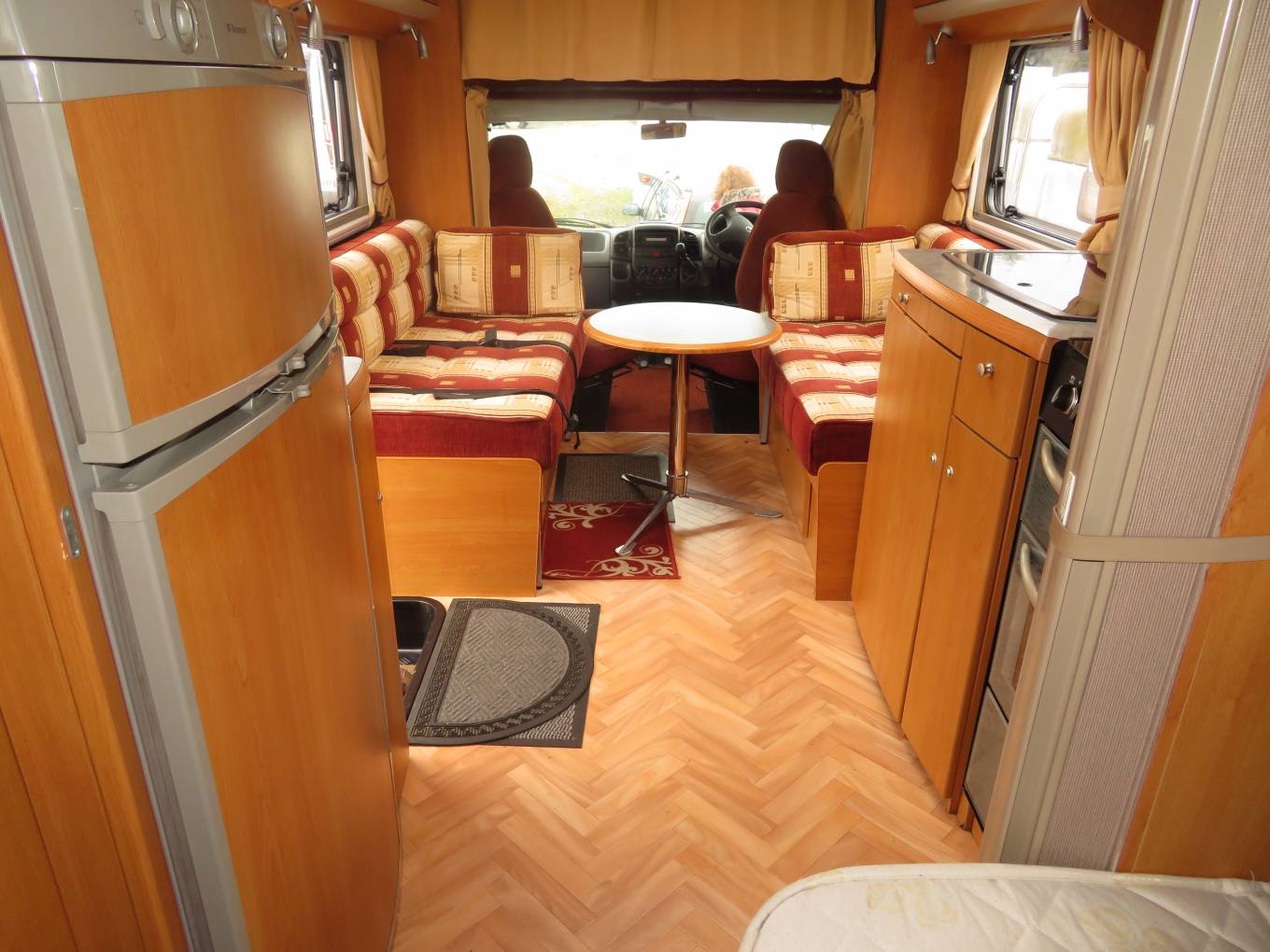 The motorhome has an excellent lounge area which is made up of 2 side facing sofas and the front two seats which can be swivelled round. It comes with a small circular table for drinks, snacks or a game of cards and a larger table stored away if you want to enjoy a more substantial meal. There is a well equipped kitchen with oven, grill, hob with 4 gas burners, sink with drainer and a large fridge with separate freezer. This is also plenty of storage and cupboard space for all your utensils, ingredients and pots a pans.