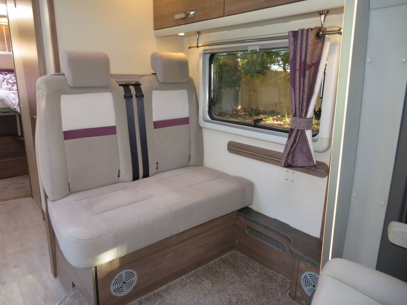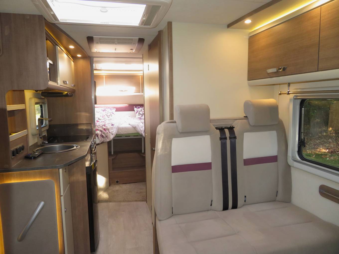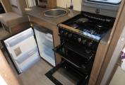 The living area a spacious front lounge which is made up of a front facing double sofa, a smaller side facing double and the two front seats. There is also a separate table, stored in the garage, that can be placed in the centre to create the ideal place to enjoy and evening meal. The motorhome has one smart TV in the lounge area that works directly off the Wifi - so requires a dongle. Moving further back the Roadstar has an extremely well equipped kitchen with oven, grill, hob with 3 gas burners and an electric hotplate, microwave oven, sink with mixer tap and fridge with ice compartment.