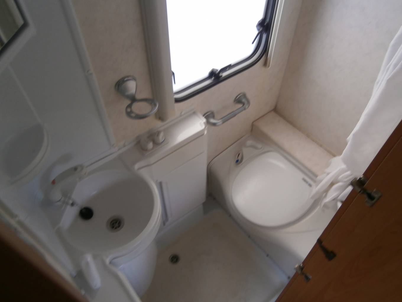 Across there is a half wardrobe which holds the main table & has a large mirror on the door & a heater below, which is next to the rear washroom, featuring a Thetford cassette toilet, vanity unit with washbasin & storage plus a frosted opening window.