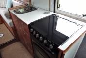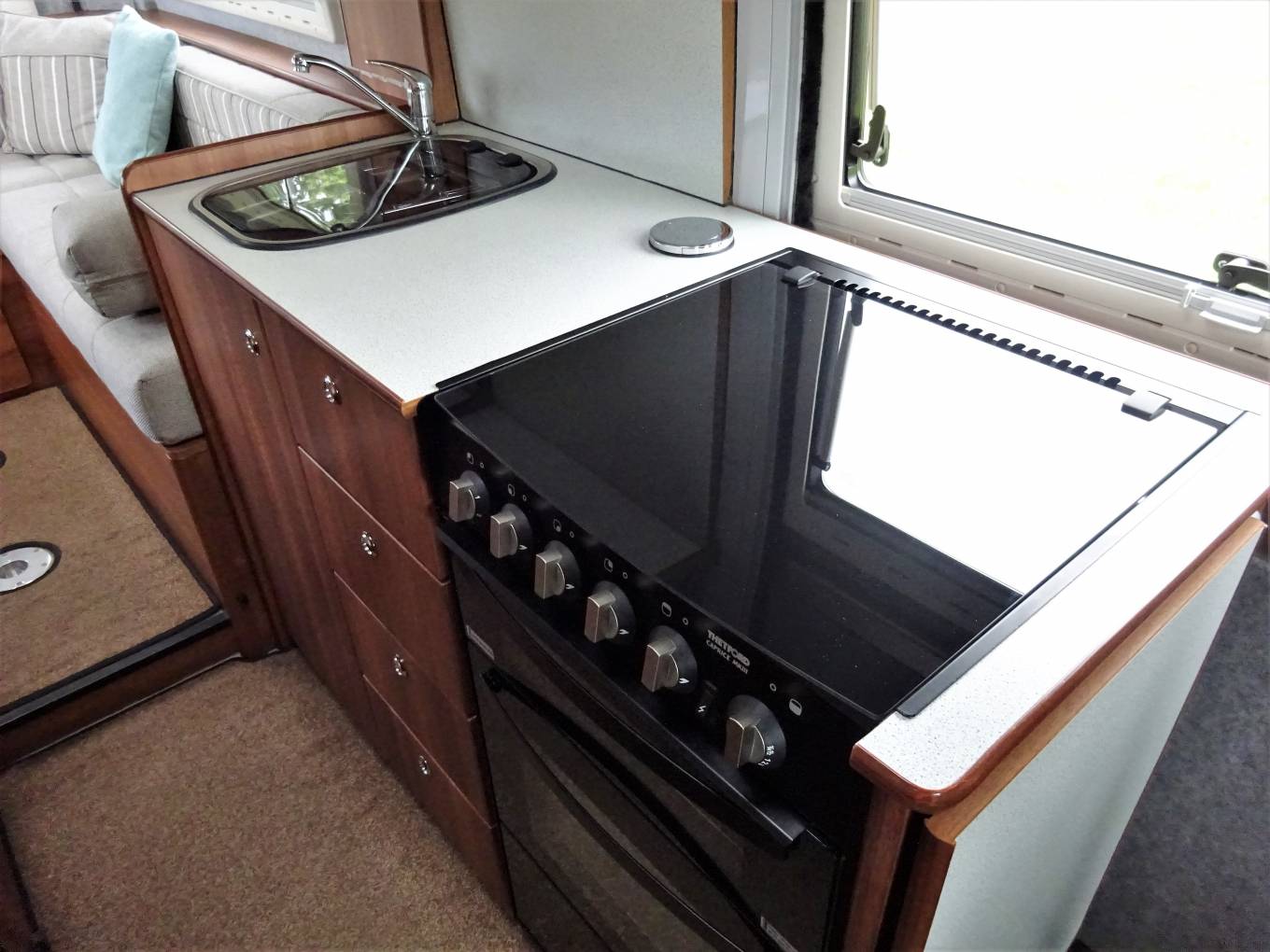 The central kitchen comes complete with Thetford oven with hob (3 gas and one electric ring), Waeco fridge/freezer and sink with a clever in-built drying rack.